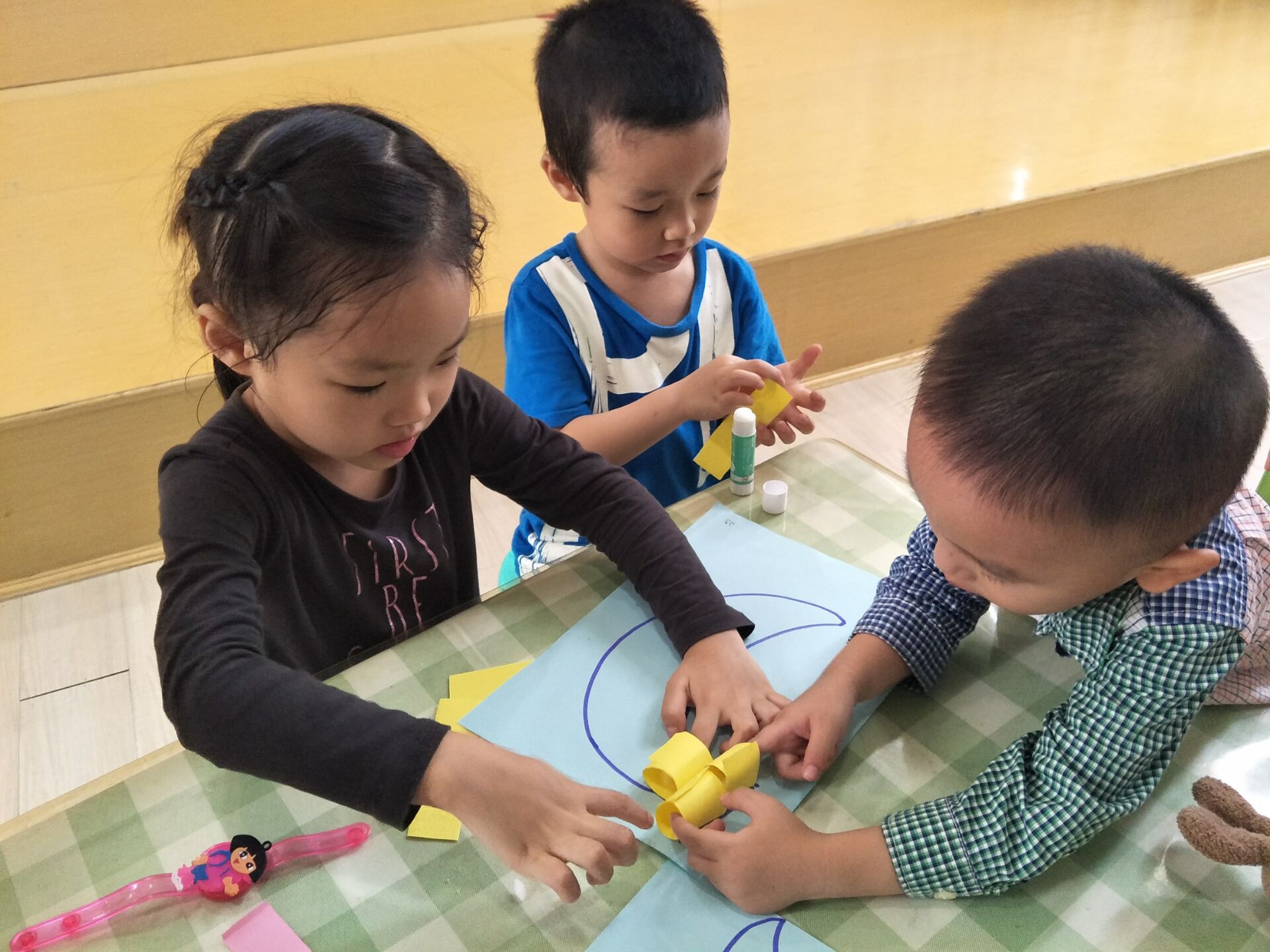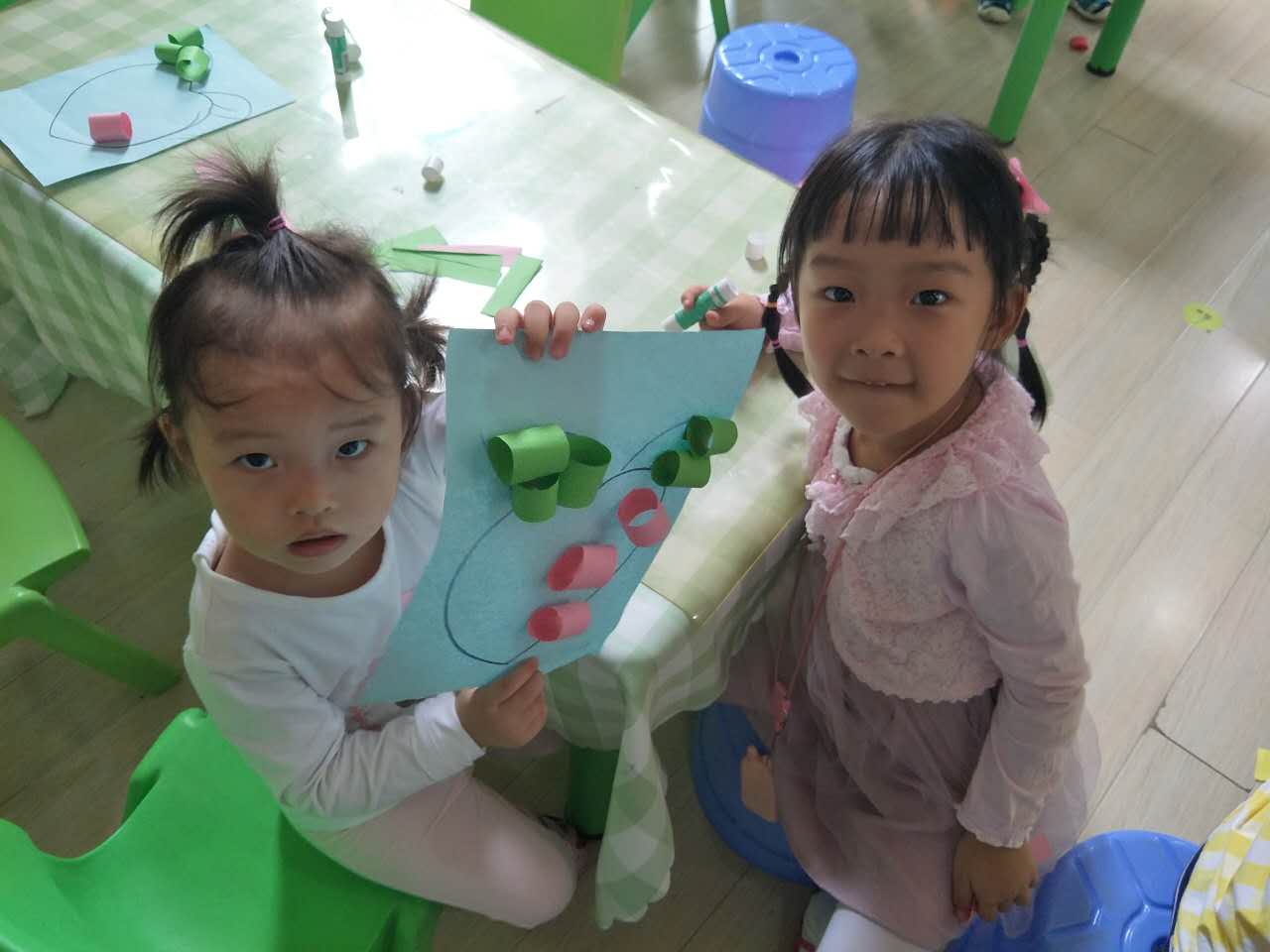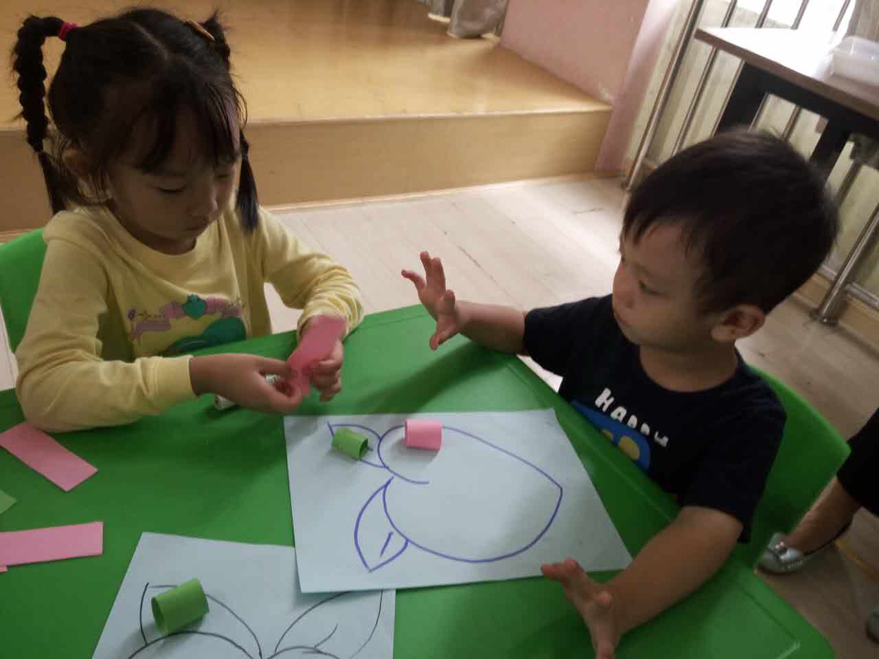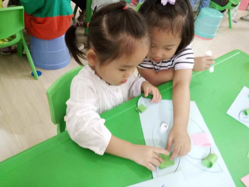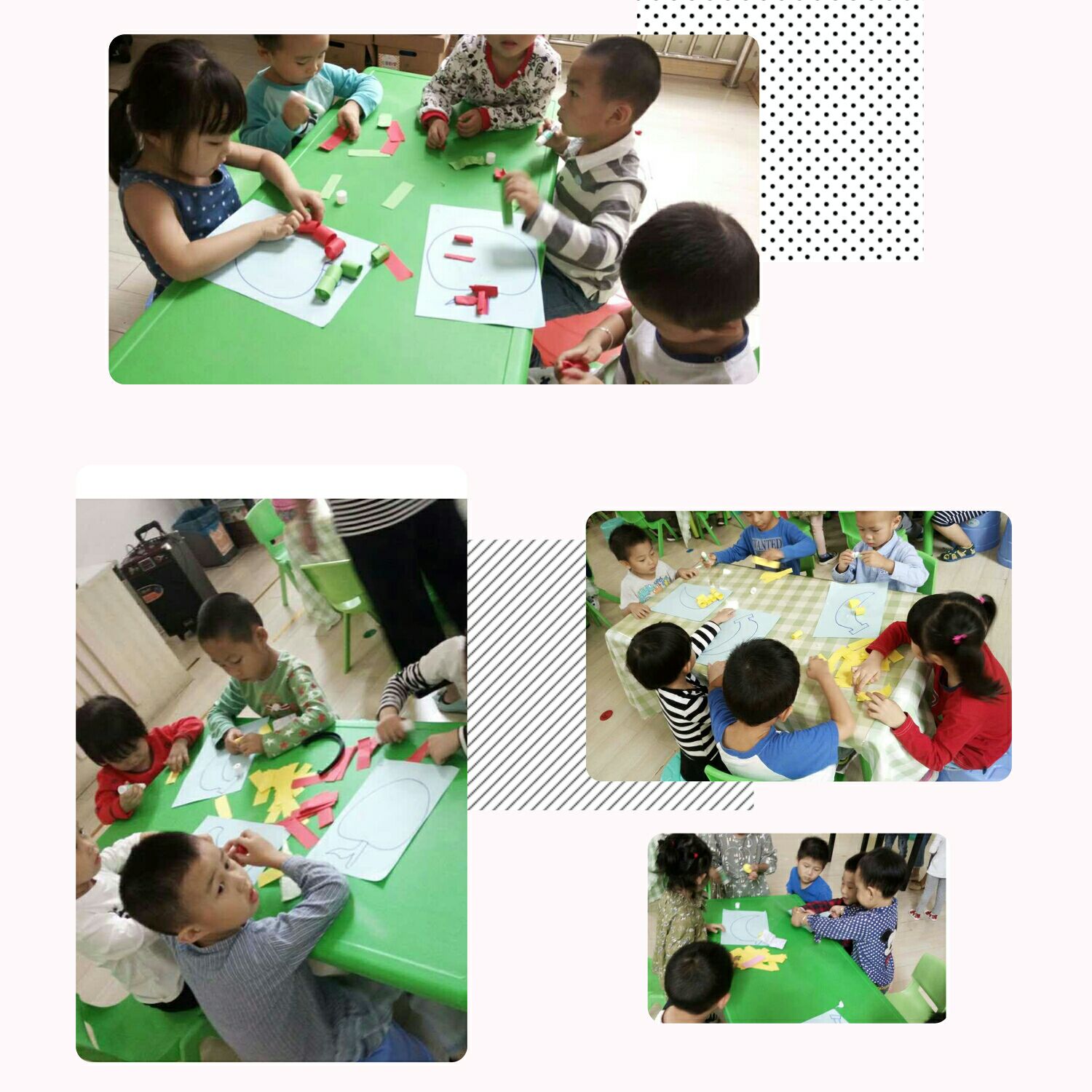 大哥哥姐姐细心耐心的与弟弟妹妹一起制作手工,给水果宝宝穿上新衣服。