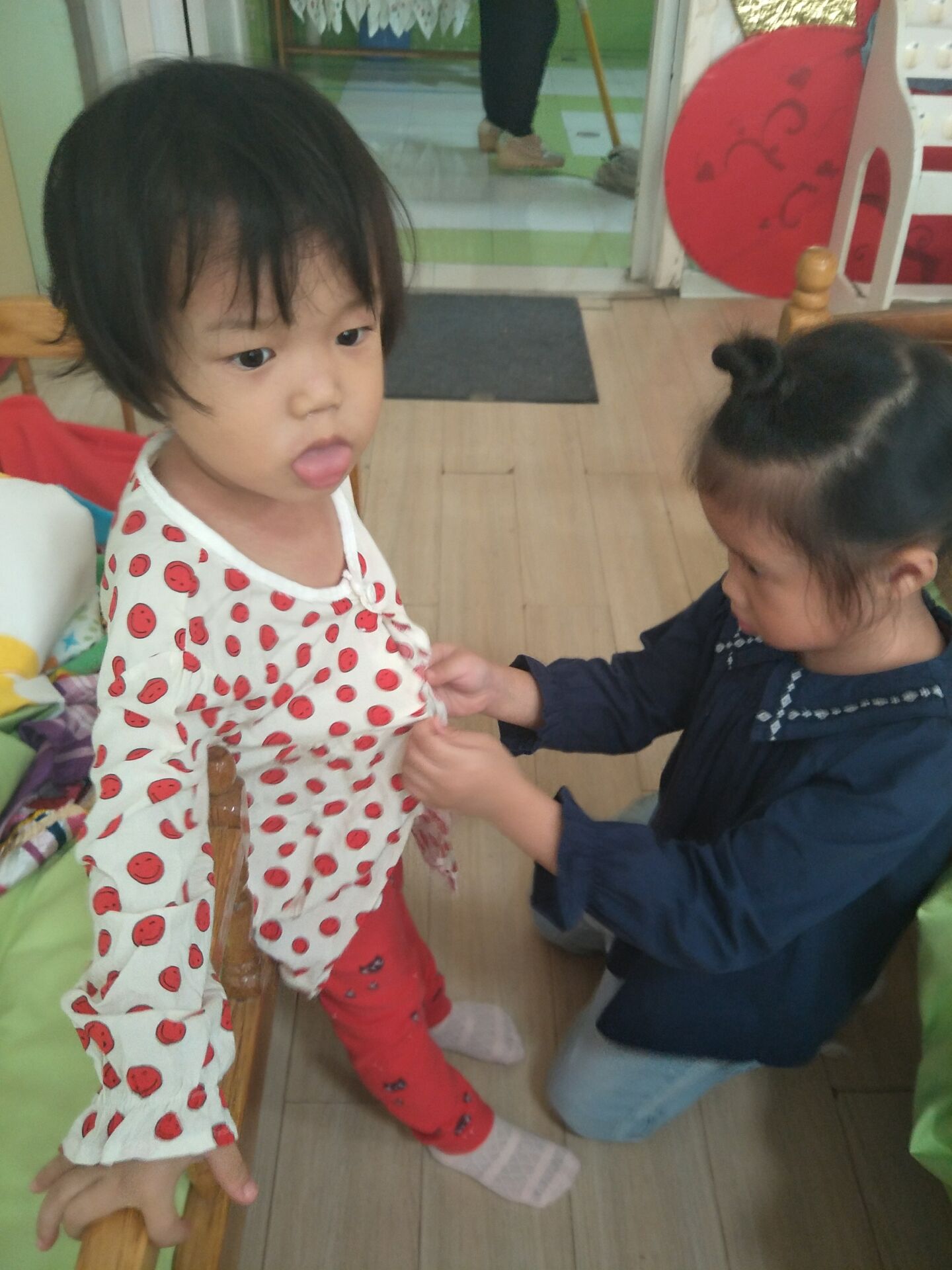 找到相应的洞洞钻进去,衣服就穿好啦!爸爸妈妈放心吧!老师爱我,哥哥姐姐也爱我!