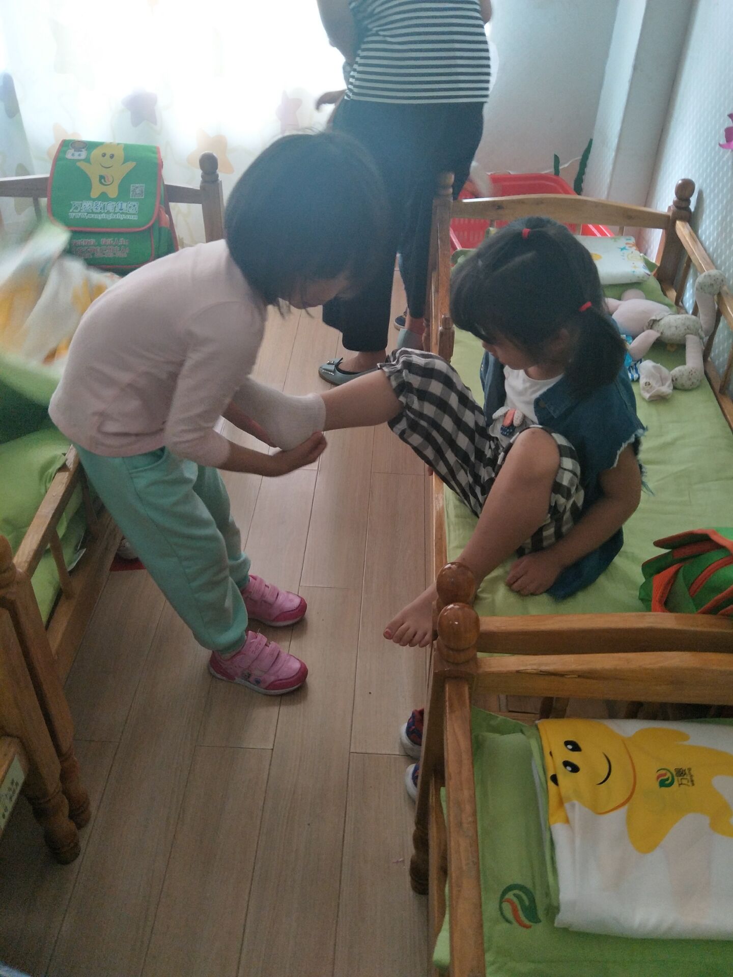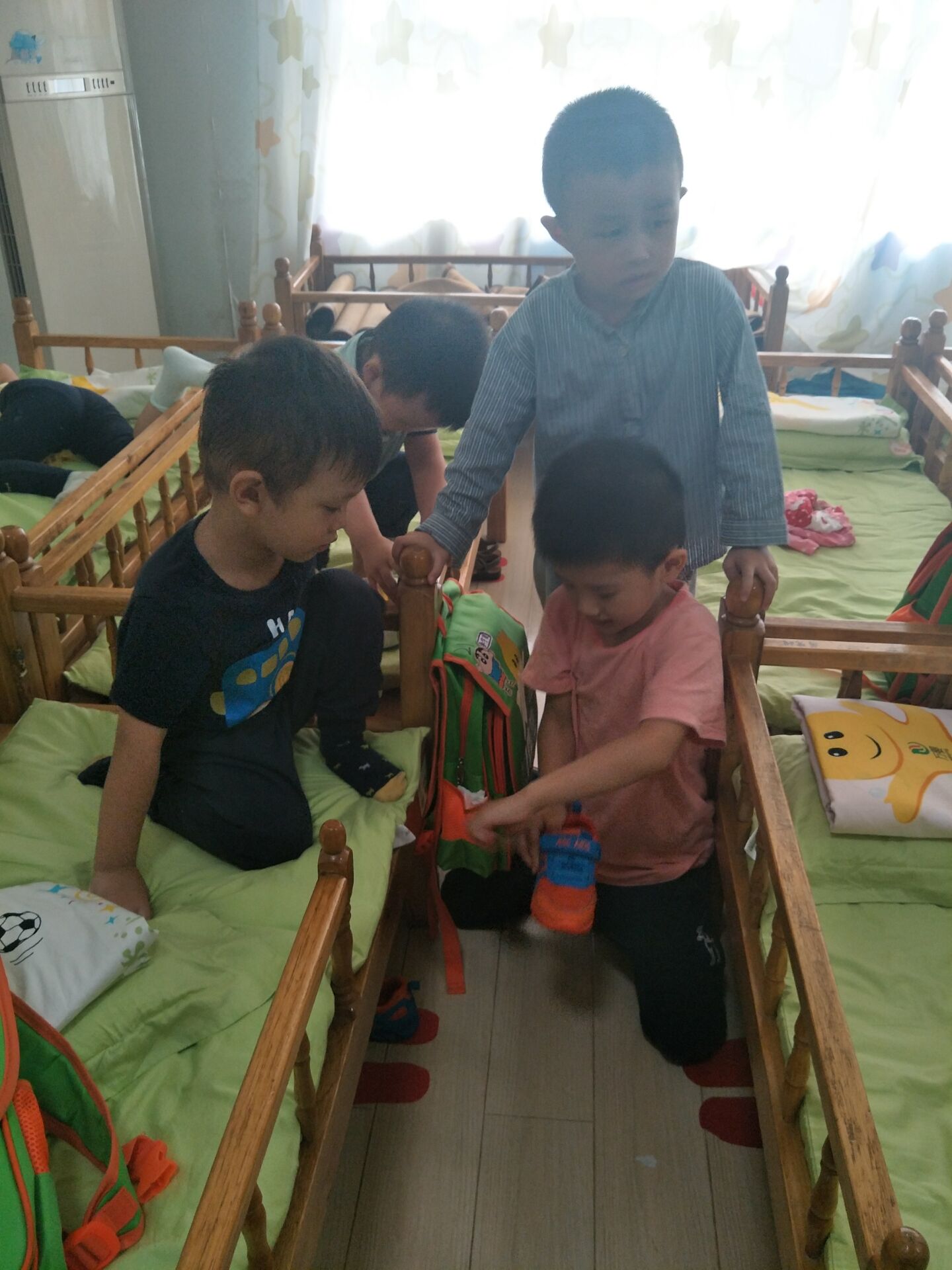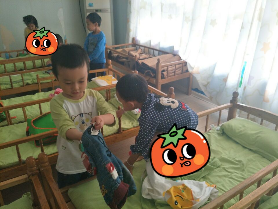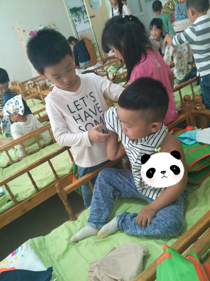 午睡前,哥哥姐姐主动地关心和照顾弟弟妹妹,给予力所能及的帮助:协助他们换衣服、折衣服、将衣物摆放整齐……大班哥哥姐姐充分体验了做哥哥姐姐的自豪感和帮助他人带来的快乐。