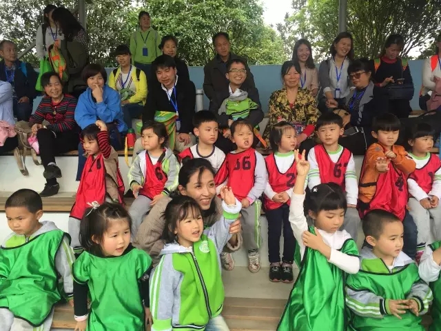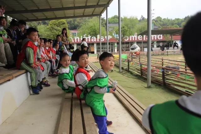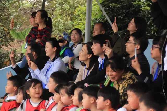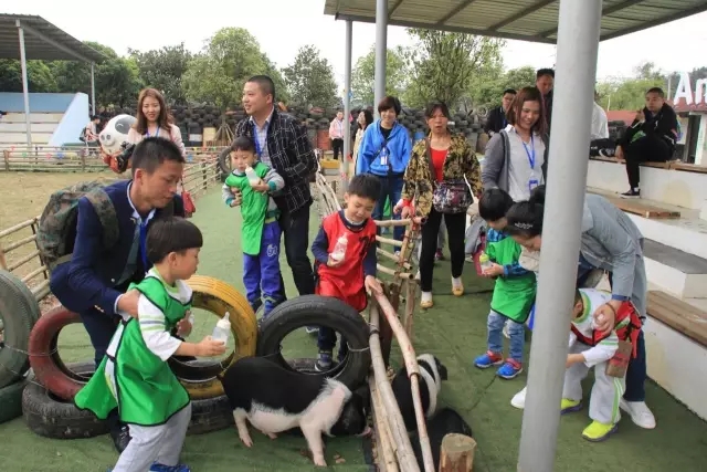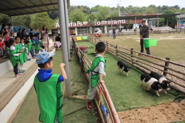 宝贝和家长们在看台上观看小猪们精彩的表演