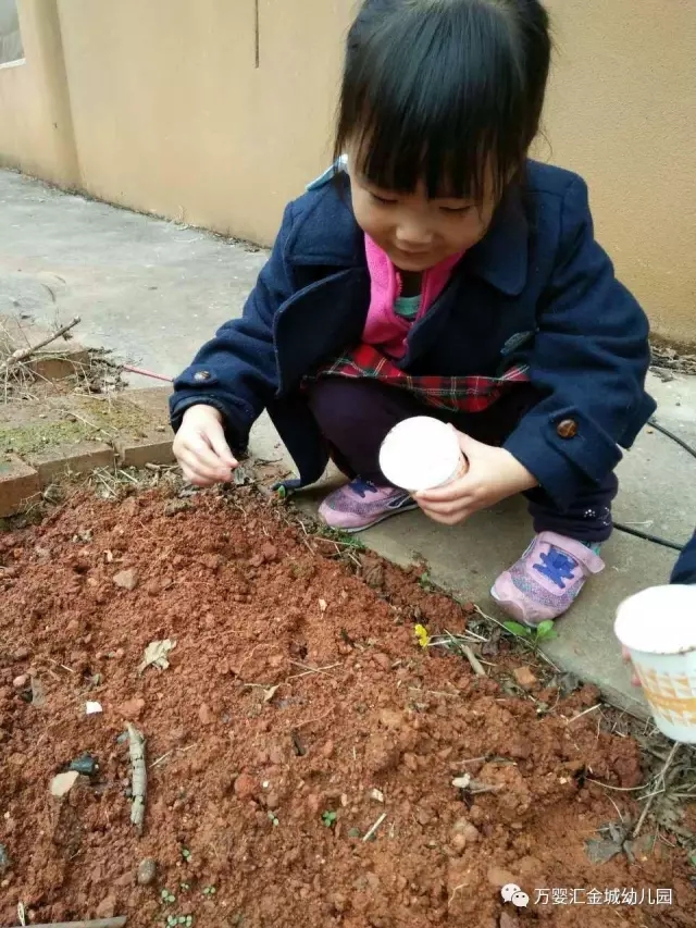 春风中,人们走进自然,放飞身心,精神抖擞着,筋骨舒活着。历经风雪磨砺的树枝,一改僵硬呆板的冬姿,仪态轻柔娇嫩,涨满着青春的气息!遍野的小草像是听到了冲锋的集结号,争先恐后地钻了出来,为春天加油,为春天喝彩,为春天平添生机! 春天它是一个充满生机的季节,我们大家一起种植,来体验这个精彩的季节 。 我要给自己的小种子做个不一样的家 我要种植什么的种子呢?红豆 绿豆 辣椒。。。。。。 土地太干燥,得用点水把土地浸湿 你猜猜我种的是什么种子?? 生活即教育,行为即课程。,今天的活动是生态课程的一个缩影,幼儿在与大自然的接触中获得经验,在体验中能力得到发展。一花一世界,一果一乾坤,对孩子而言,最美的春天在菜园里,在劳动中,更在幼儿园的生活里……