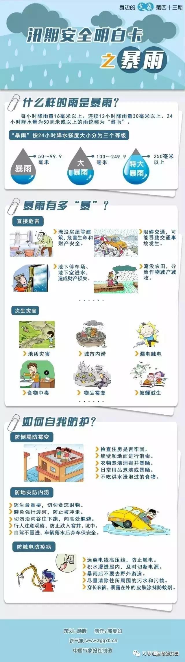 尊敬的家长: 您好! 据湖南省气象台预计,今天湘中以北部分大到暴雨,局地大暴雨;明天雨区略有南压,湘西南、湘东北部分大到暴雨,局地大暴雨;湘中以北暴雨持续到7月2日,3日降雨强度有所减弱,4-5日湘西北局地仍有暴雨。 气象专家认为,本次降雨过程将是今年湖南主汛期防汛最关键的时期。由于这次暴雨中心与上次高度重合,要提防各类次生灾害的发生。 气象专家提醒,今日至7月2日的降雨过程是湖南灾害易发时期,需要特别防御城乡内涝、山洪地质灾害,加强水利水库巡查和调度,关注道路交通畅通和景区安全,关注暴雨洪涝对农业的影响,以及暴雨中心区学生上学放学路途中的安全等。 强降雨持续,幼儿的安全需要我们时刻警惕,需要家庭、学校、社会齐抓共管。万婴幼儿园已根据幼儿年龄特点,开展汛期安全主题教育活动,通过采取情景式的角色游戏对幼儿进行防汛防溺水教育,让幼儿在游戏中掌握安全常识和自救技能;同时,通过安全教育和隐患排查,确保幼儿在校期间的人身安全。 为切实做好汛期学校安全工作,切实提高学生的安全意识和自护自救能力,万婴现就汛期学生的安全工作,对家长提出如下要求: