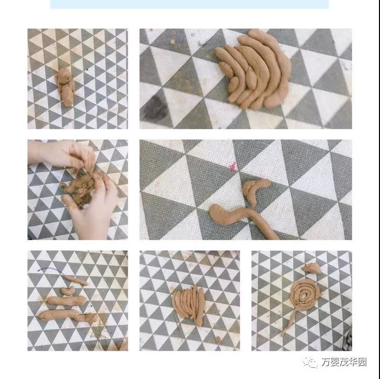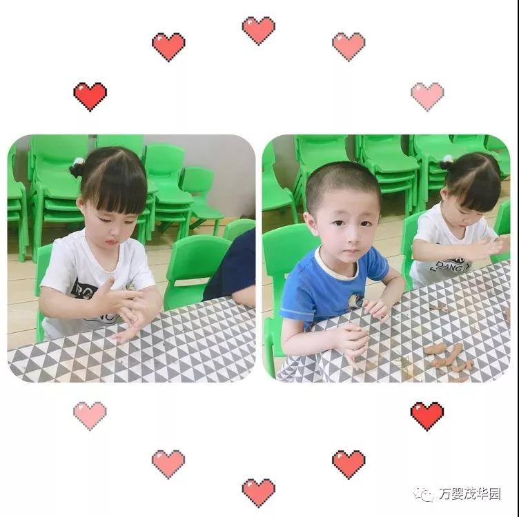 小朋友们捏的满手是泥的做棒棒糖,还有一些搓成长条做彩虹