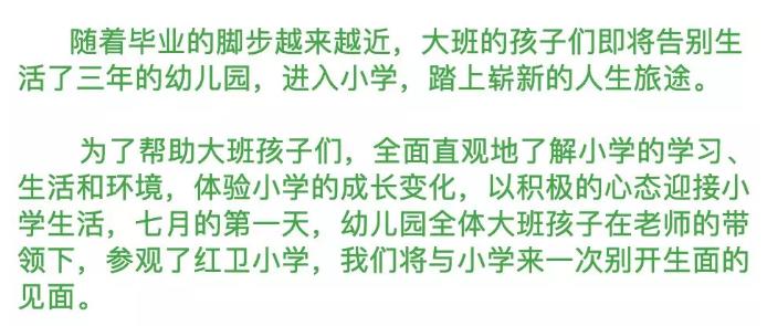 本次活动,孩子们在身临其境中对小学的生活环境有了初步的认识,感受到了小学的学习气氛,激发了他们对小学生活的向往和想做小学生的愿望,为孩子们顺利进入小学打下了良好的基础,我们相信,在不久的将来,他们个个都能迈着自信从容的步伐进入小学,开始新的学习和生活。