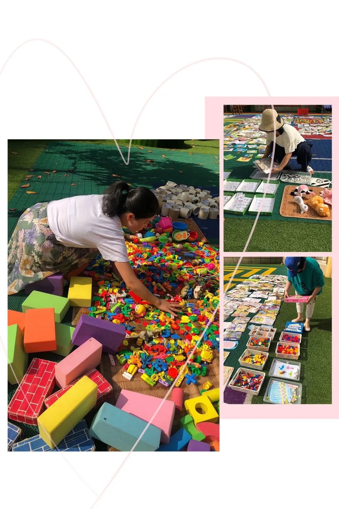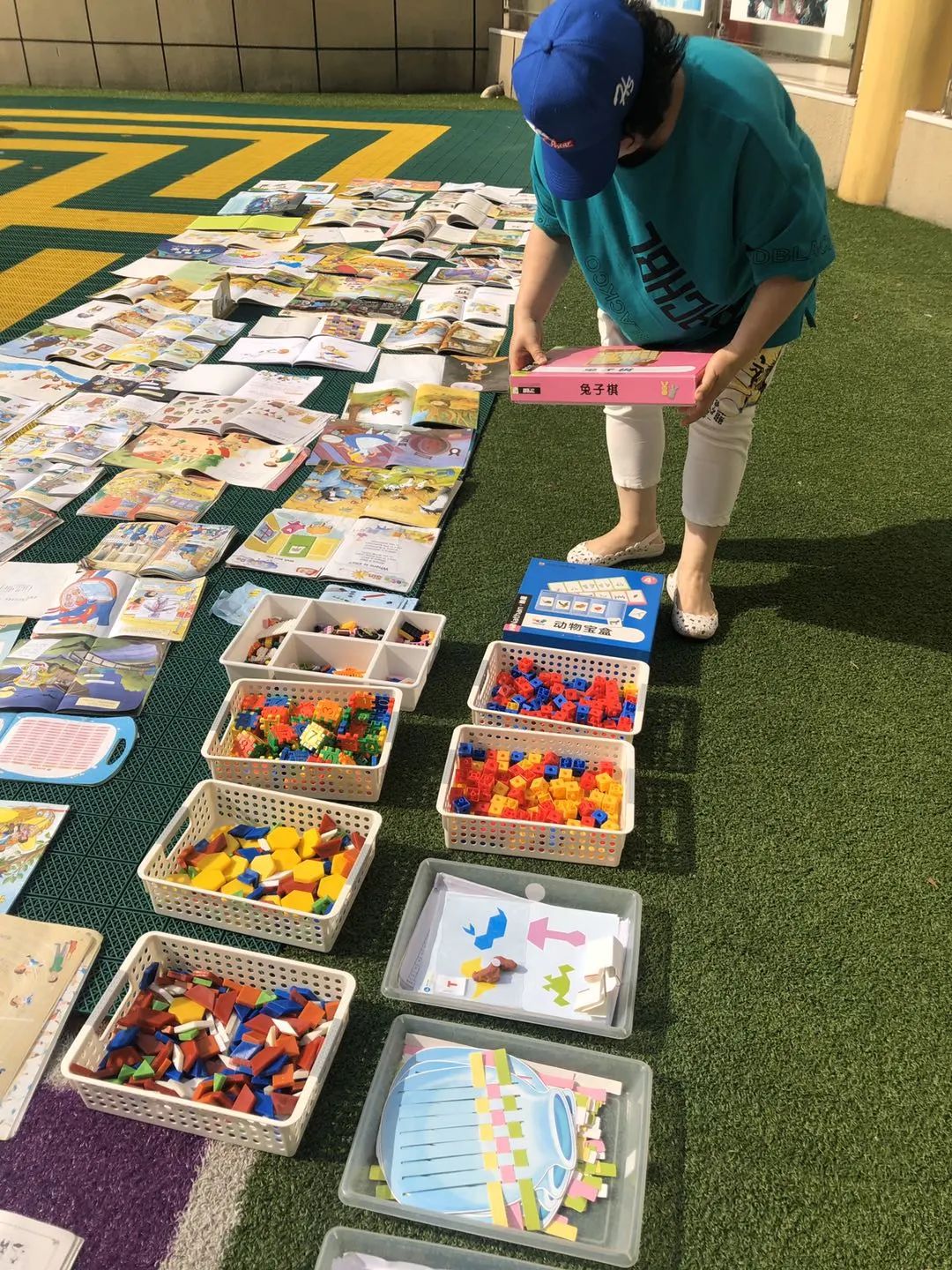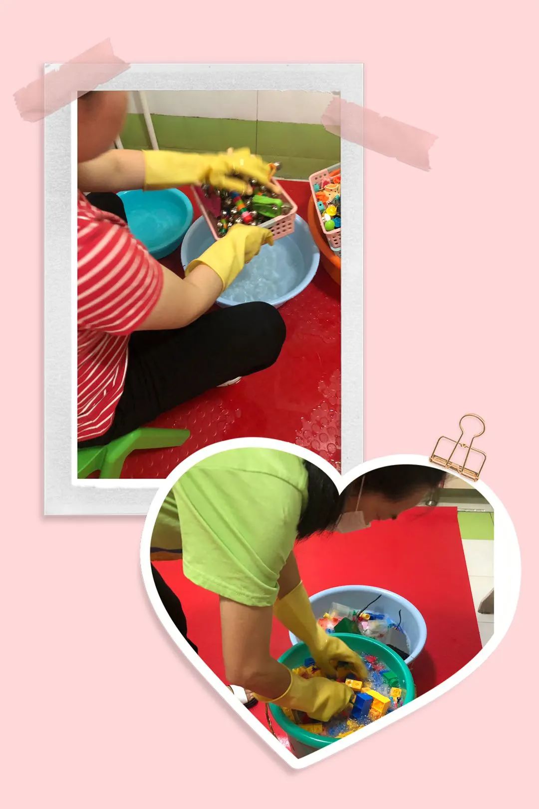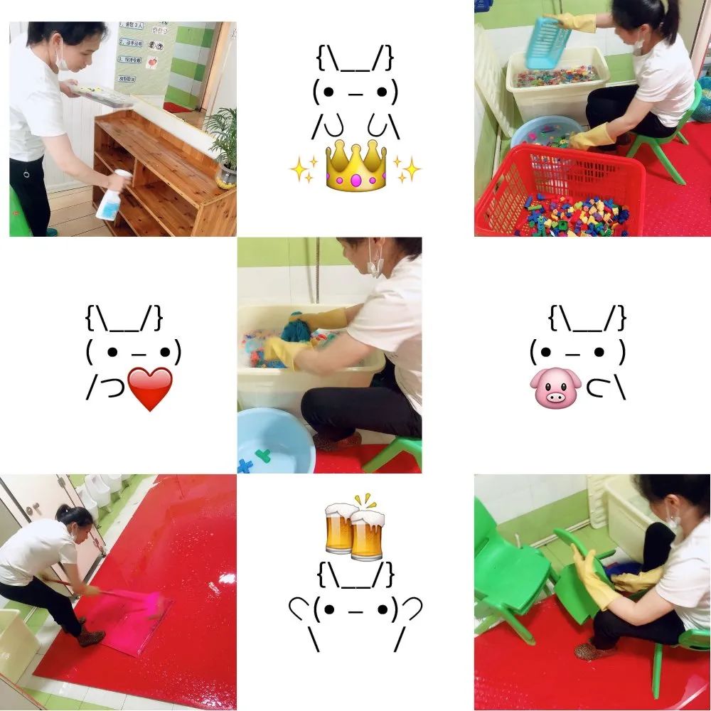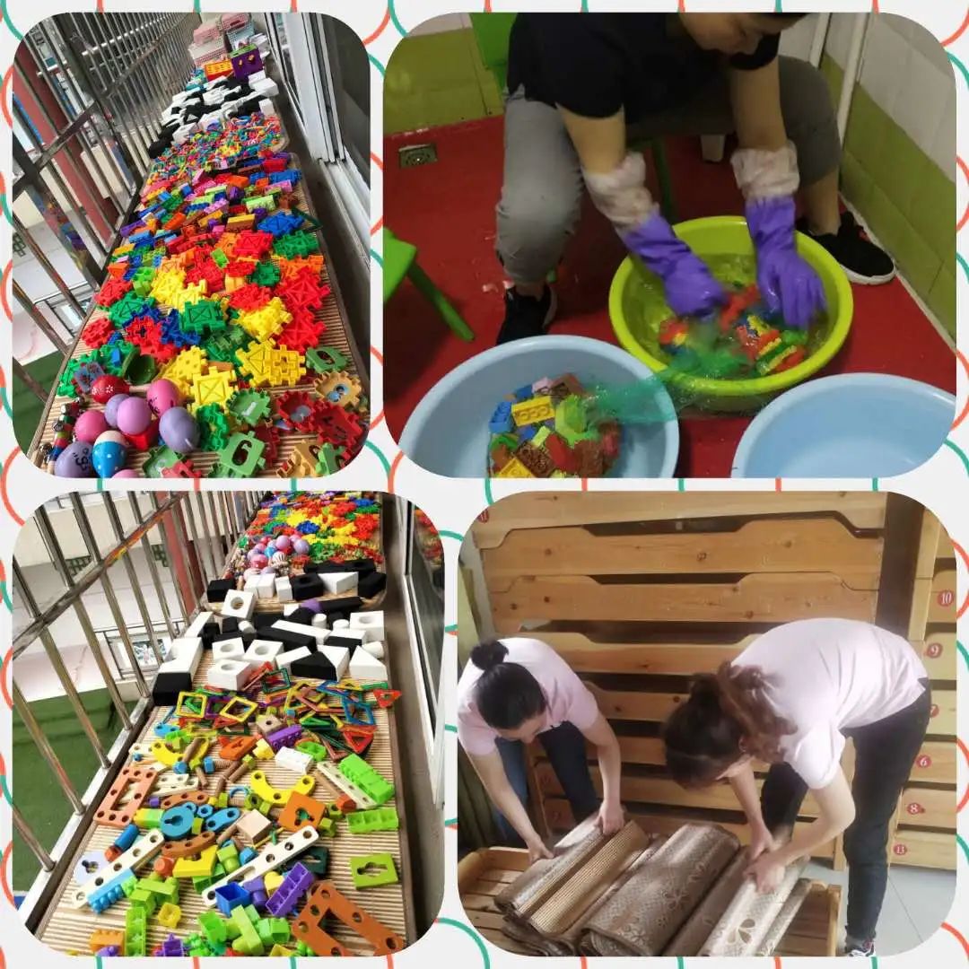细心的保育妈妈们对宝贝们的玩具、区域物品等进行了清洗与消毒,在太阳下暴晒,忙得不亦乐乎!