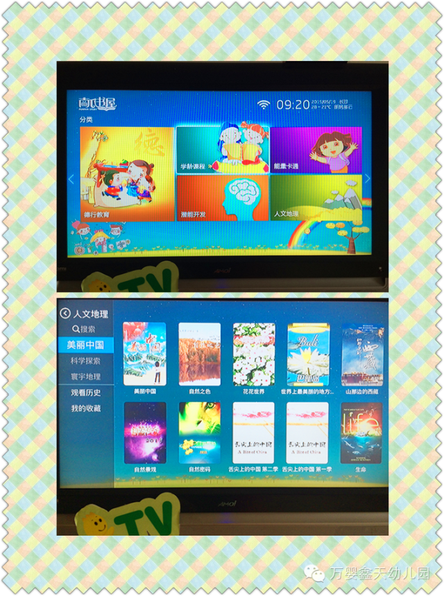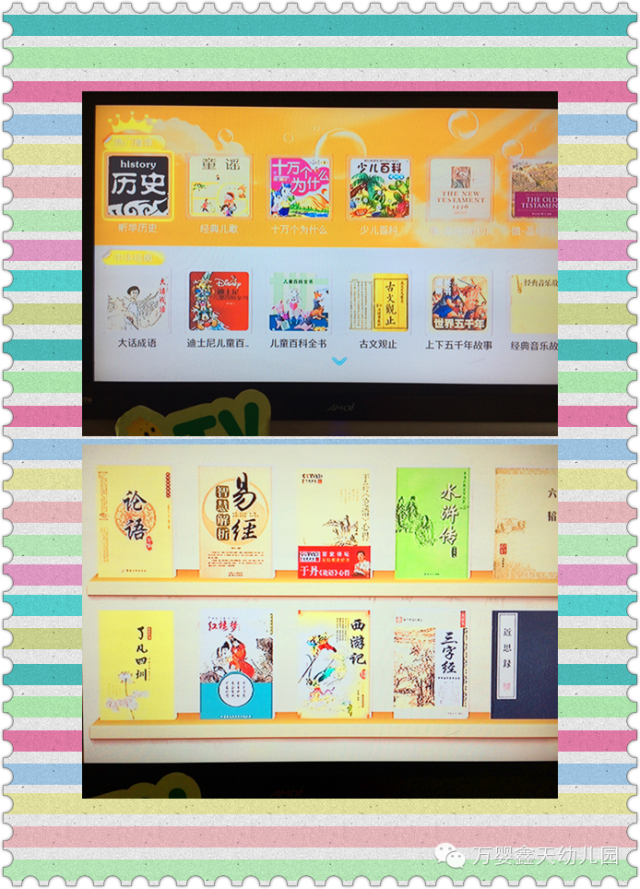 国学区中的网络电视机,将《弟子规》《孝经》《三字经》等制作成动画片,还有学龄儿童课程、潜能开发、父母学院等多个板块的内容,国学区的一切吸引了孩子们的眼球,每次进入区域都不愿意离开。