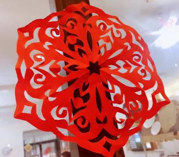 将纸折、叠、压、剪~ 瞧!不到30秒,红纸就在老师的剪刀下幻化成一个美丽的窗花。