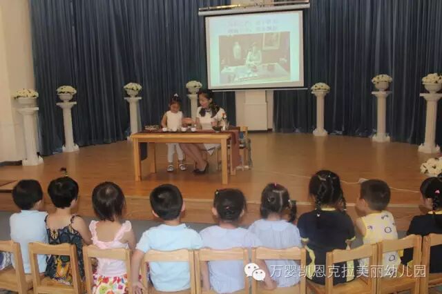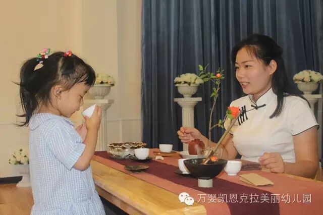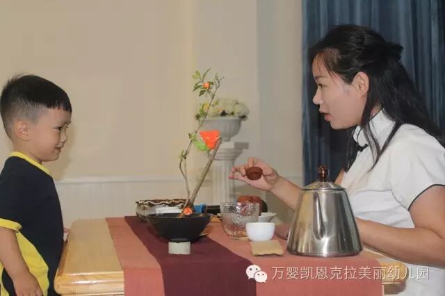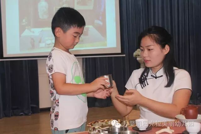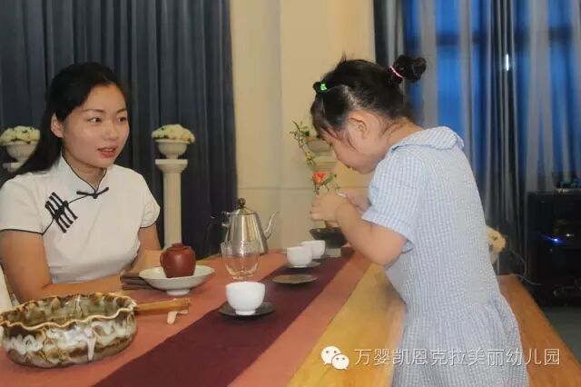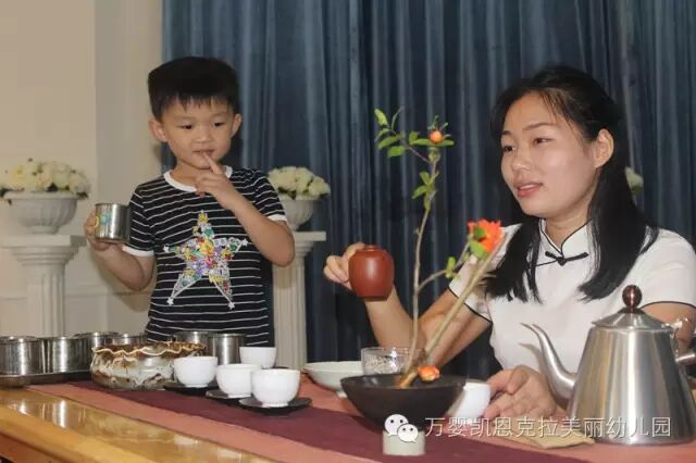 幽幽兰兮,茶水飘香。当孩子们走进用民族古典音乐所装点的安静、祥和温馨的多功能音乐厅,就被舞台上的茶艺老师阿兰和展示的各式茶具所吸引。“净器-赏茶-投茶-润茶-冲泡-敬茶-闻香-品茶-回味”阿兰老师的一举一动无不体现着中国茶文化的雅、尚、礼。我国历来就有“客来敬茶”这一民俗,在茶艺会的体验活动中,阿兰老师仪式感十足的请小客人们品茶,并请说一说茶的滋味。相信以后的过家家游戏孩子们一定会有新的玩法:“欢迎,请喝茶”!