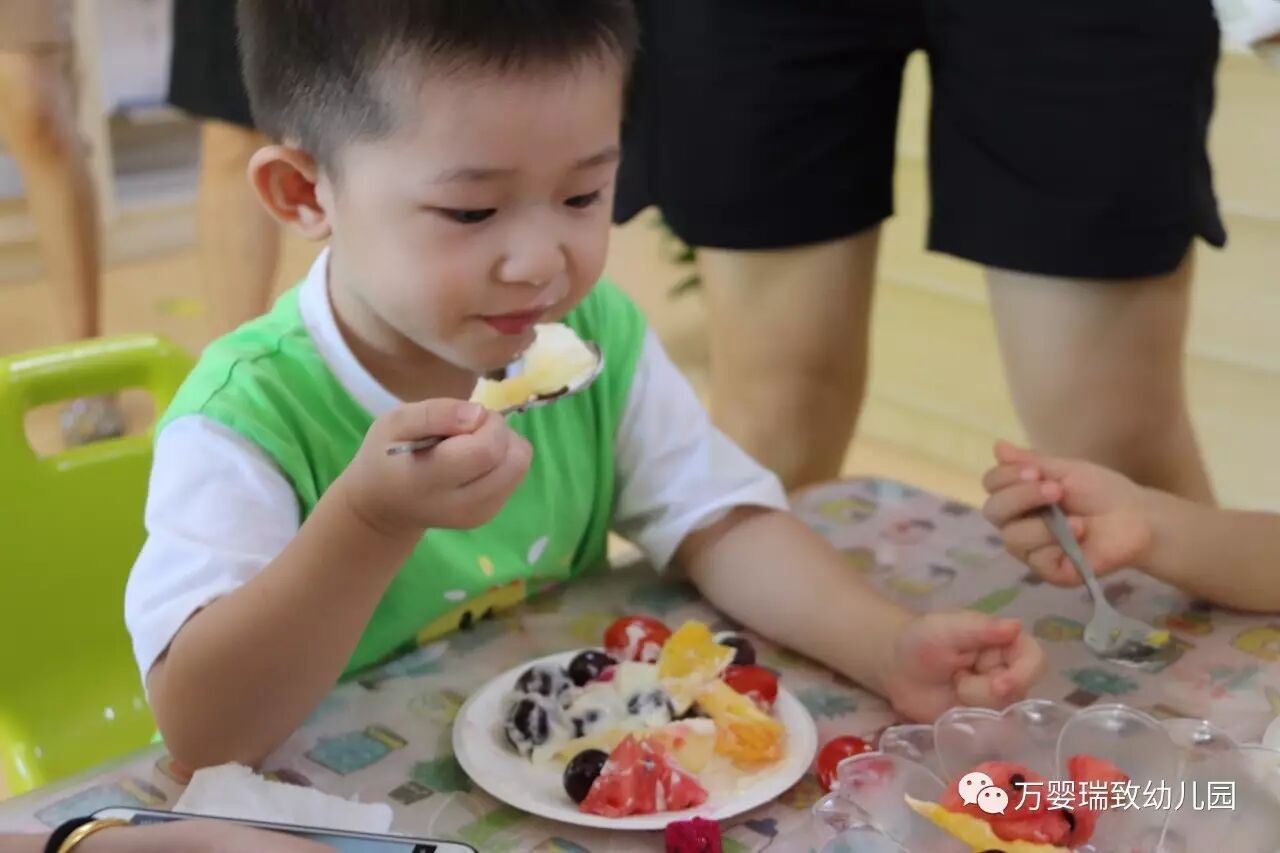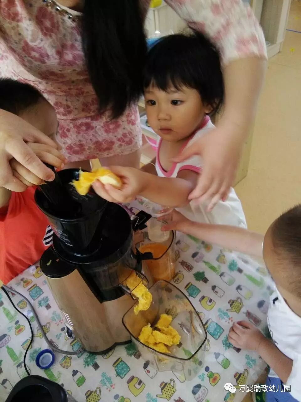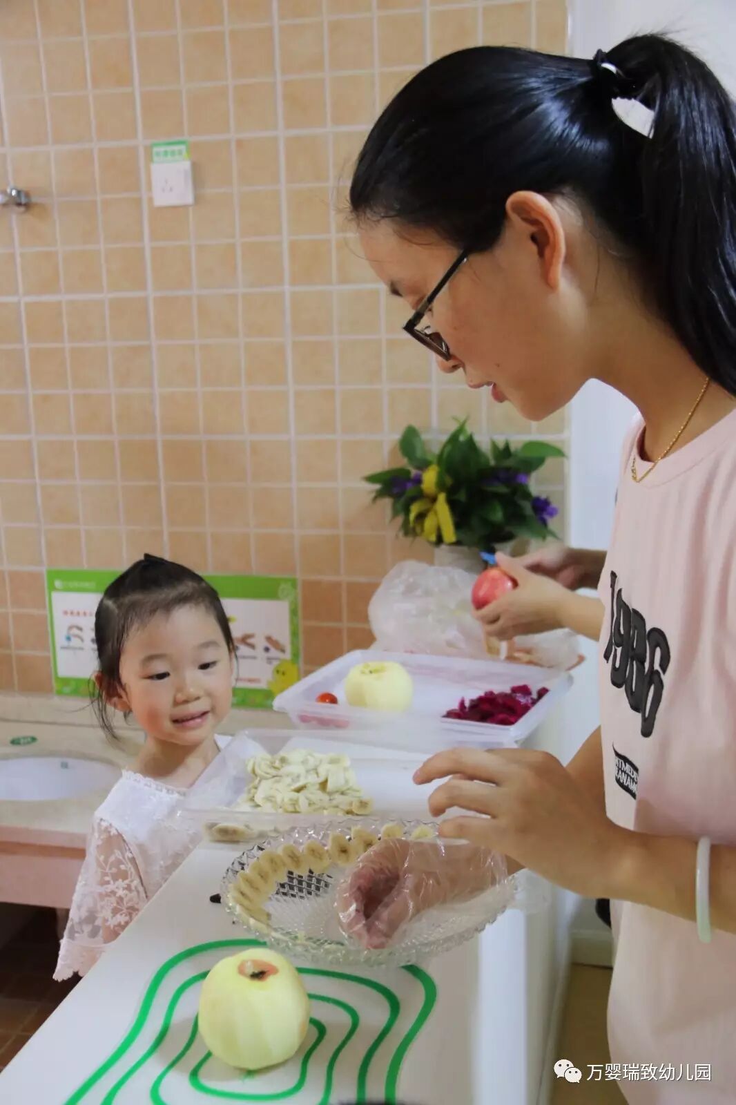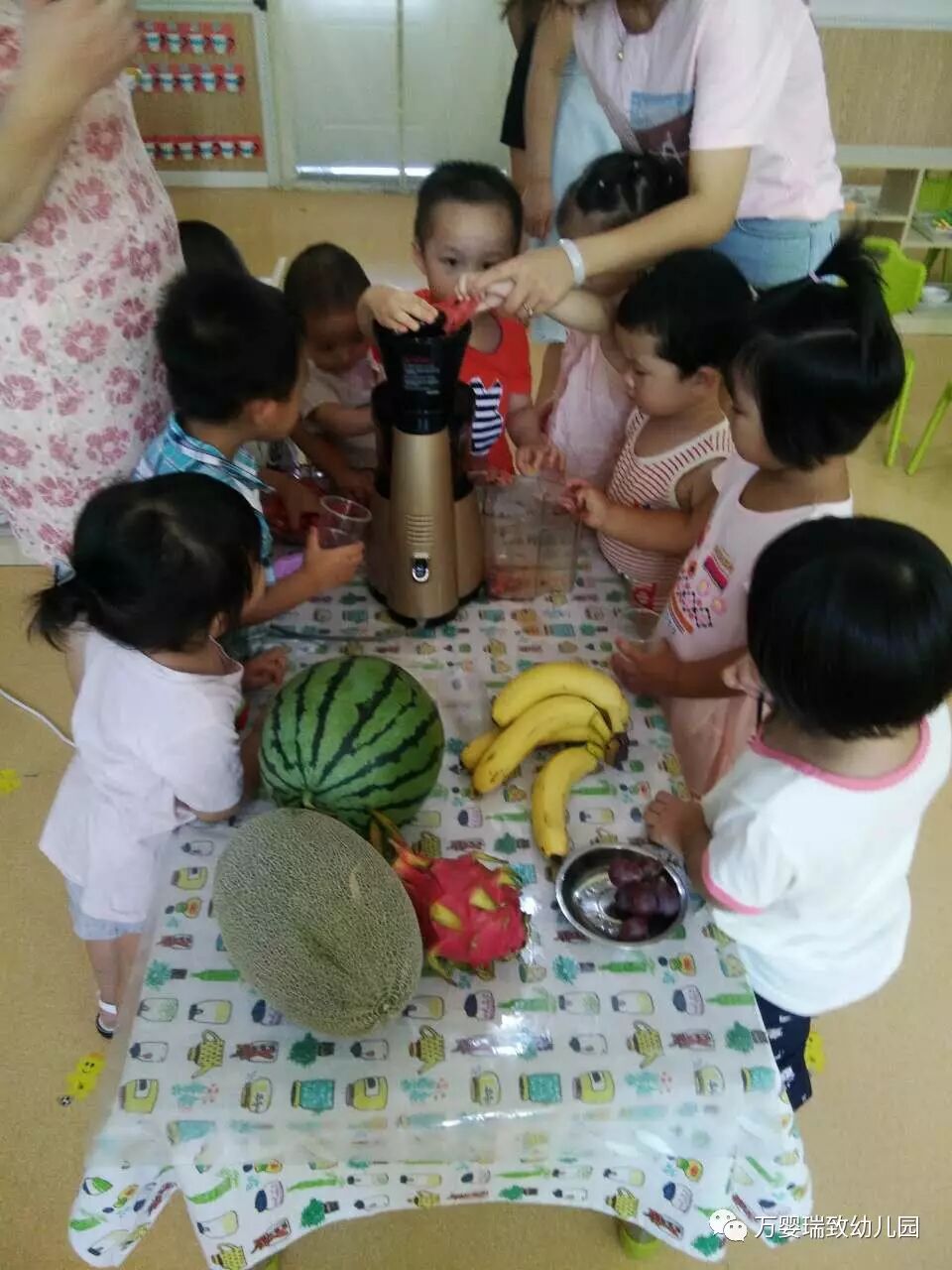 今日暑期课堂,我们瑞致园的宝贝邀请妈妈来到课堂,和小朋友一起现场制作水果沙拉和果汁。