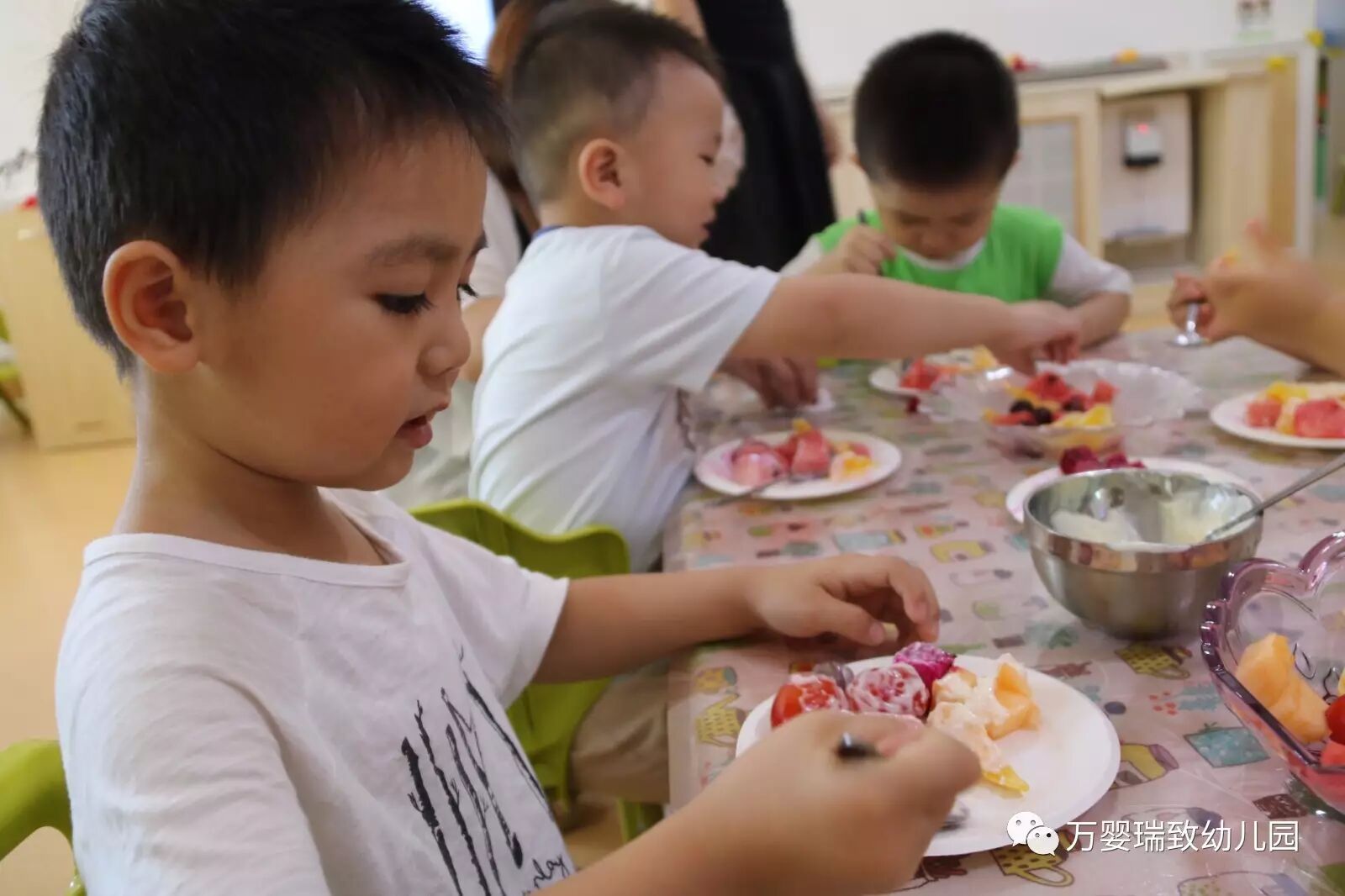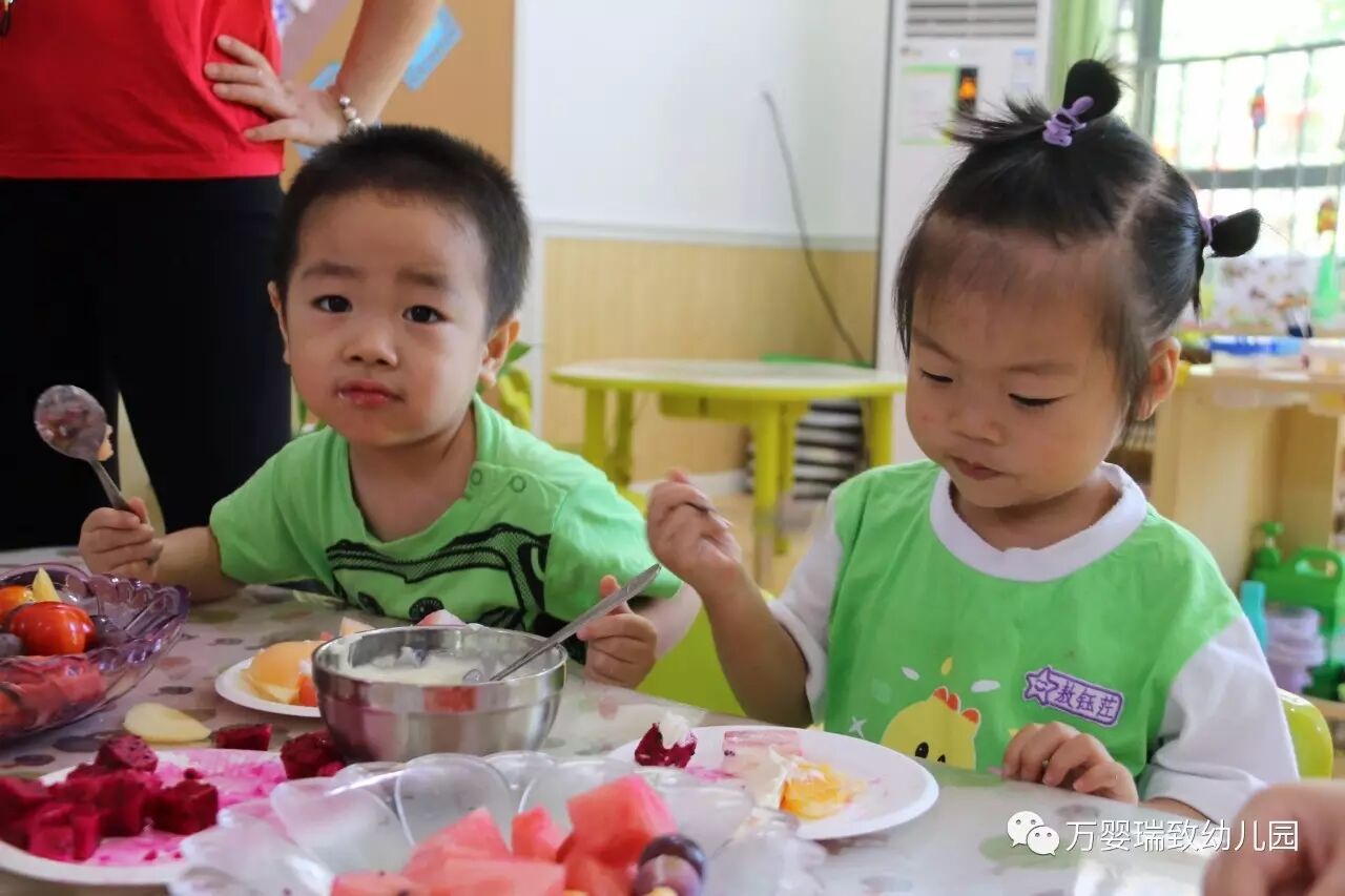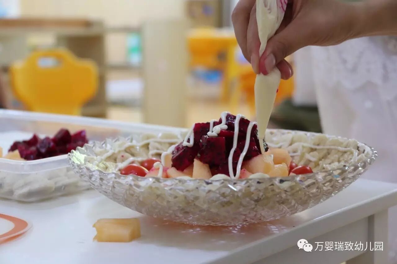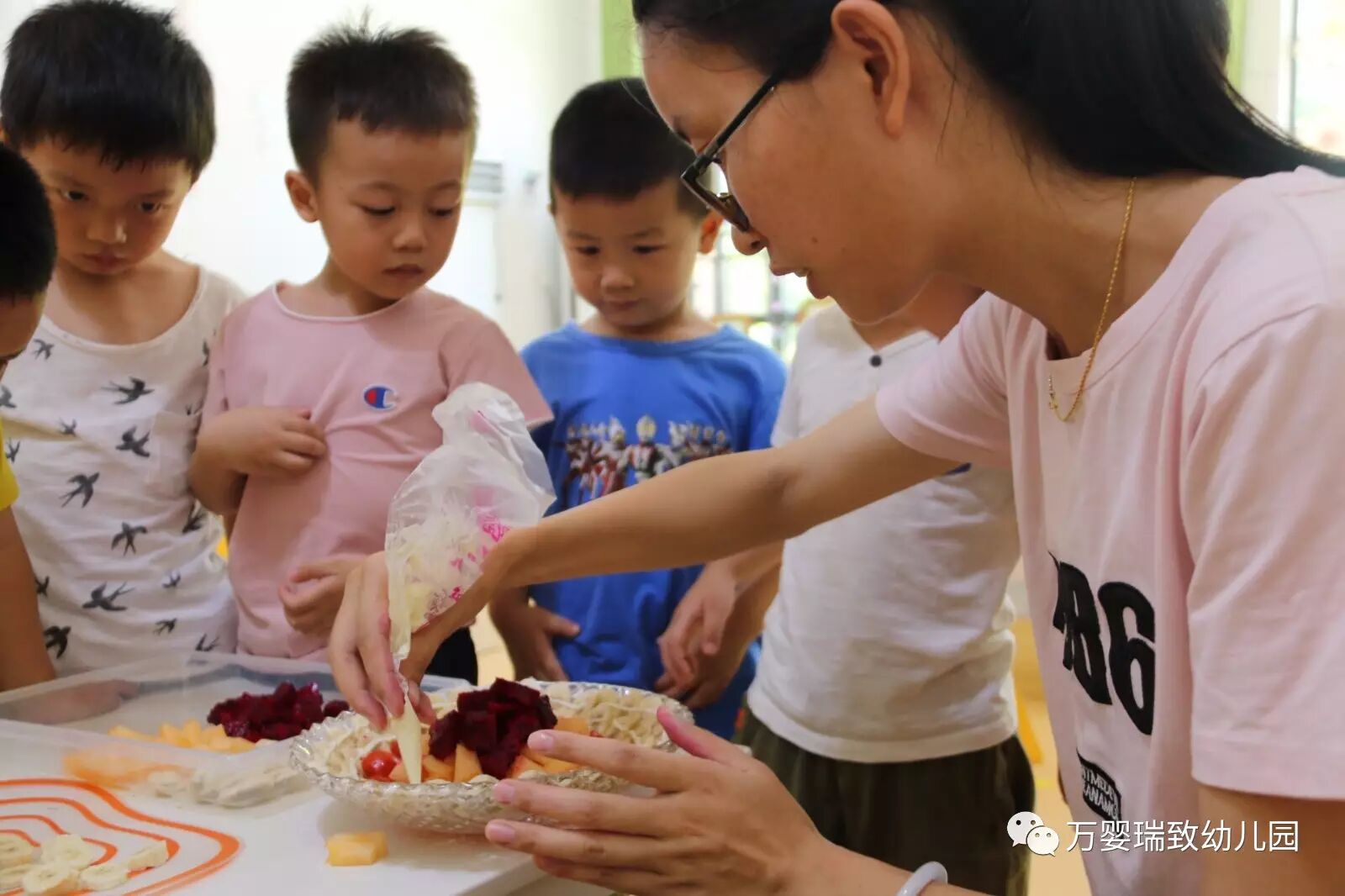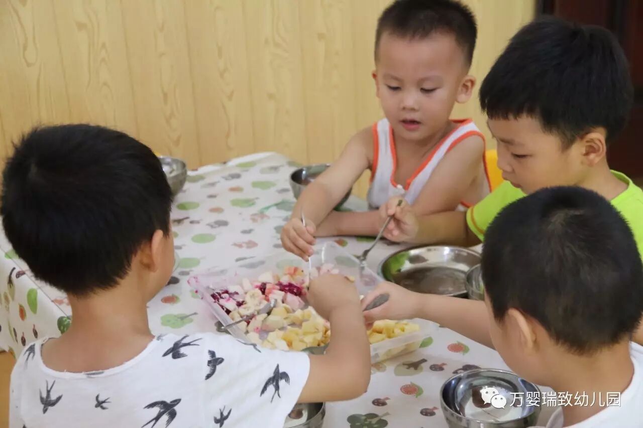 今日暑期课堂,我们瑞致园的宝贝邀请妈妈来到课堂,和小朋友一起现场制作水果沙拉和果汁。