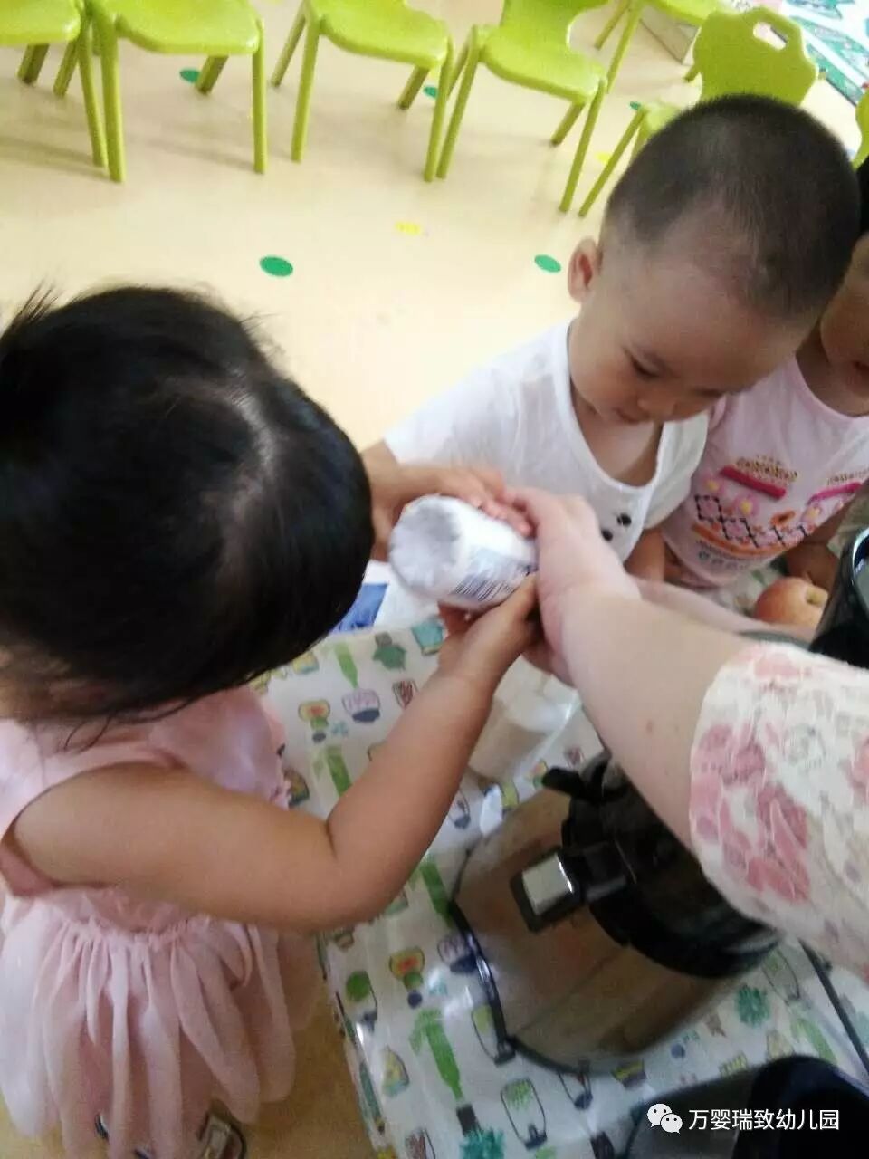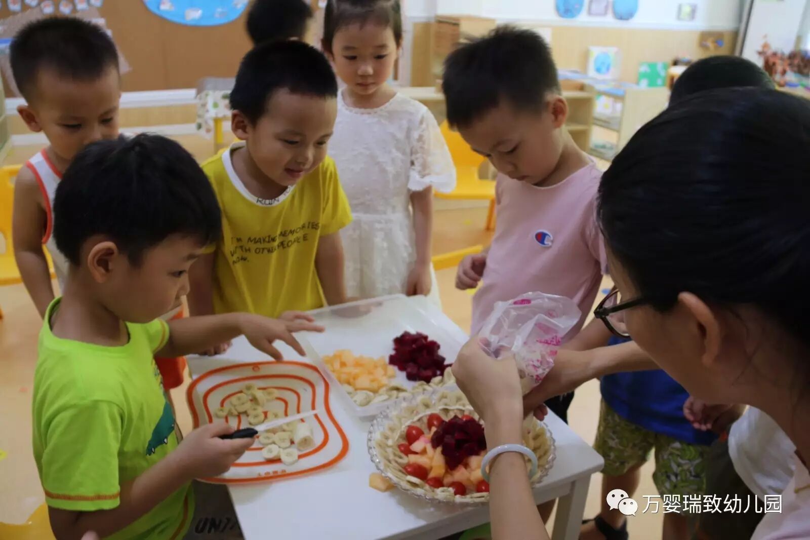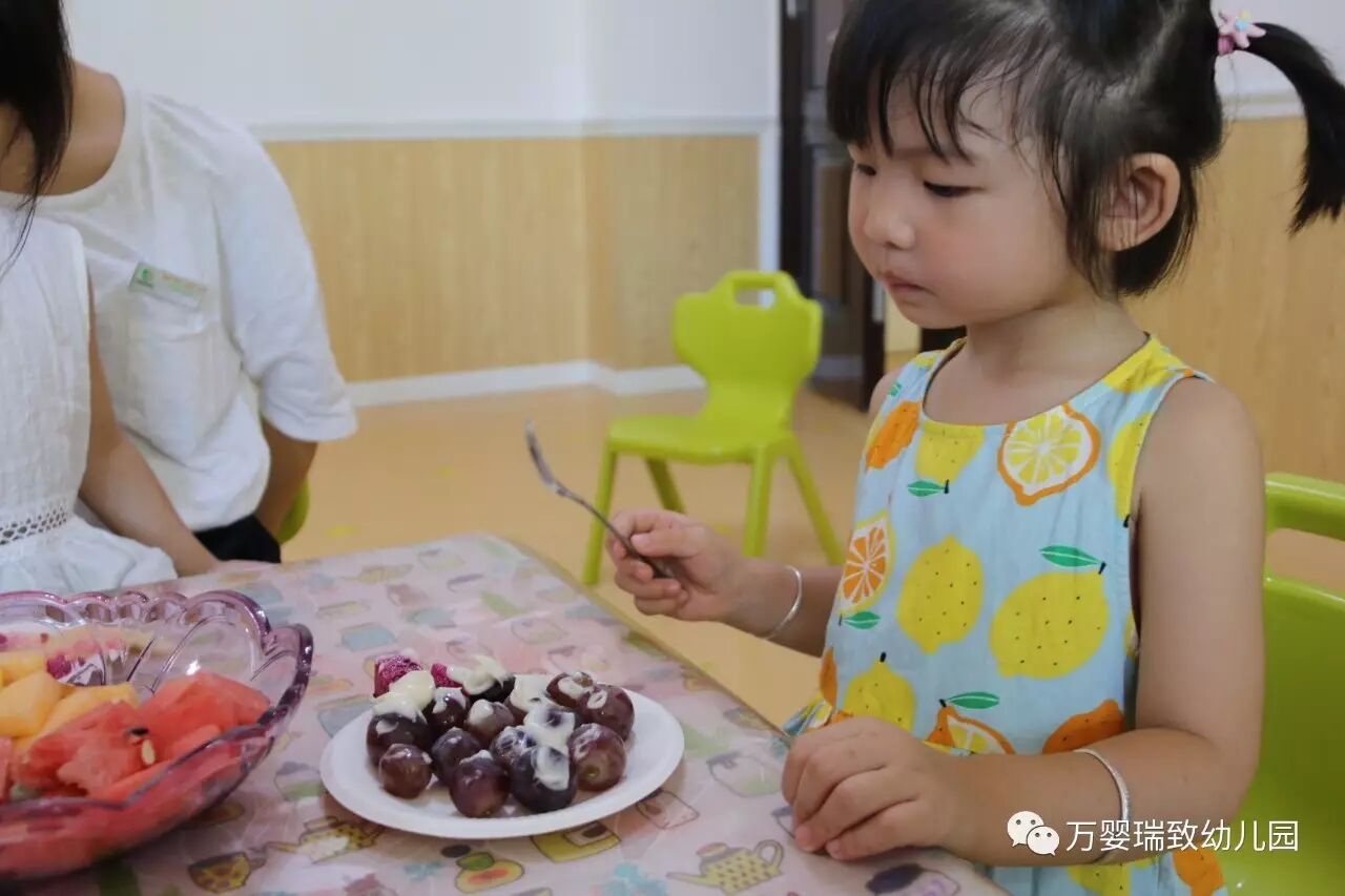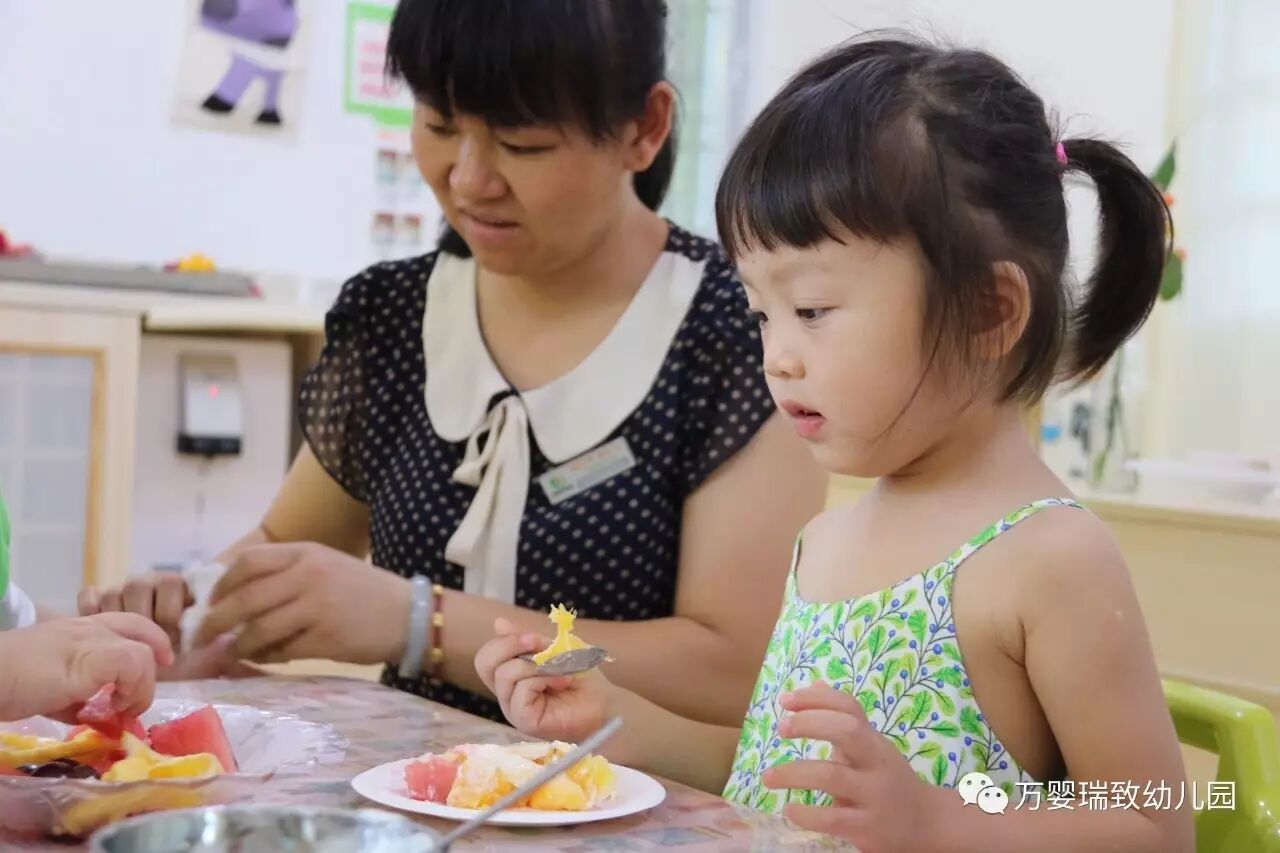 今日暑期课堂,我们瑞致园的宝贝邀请妈妈来到课堂,和小朋友一起现场制作水果沙拉和果汁。