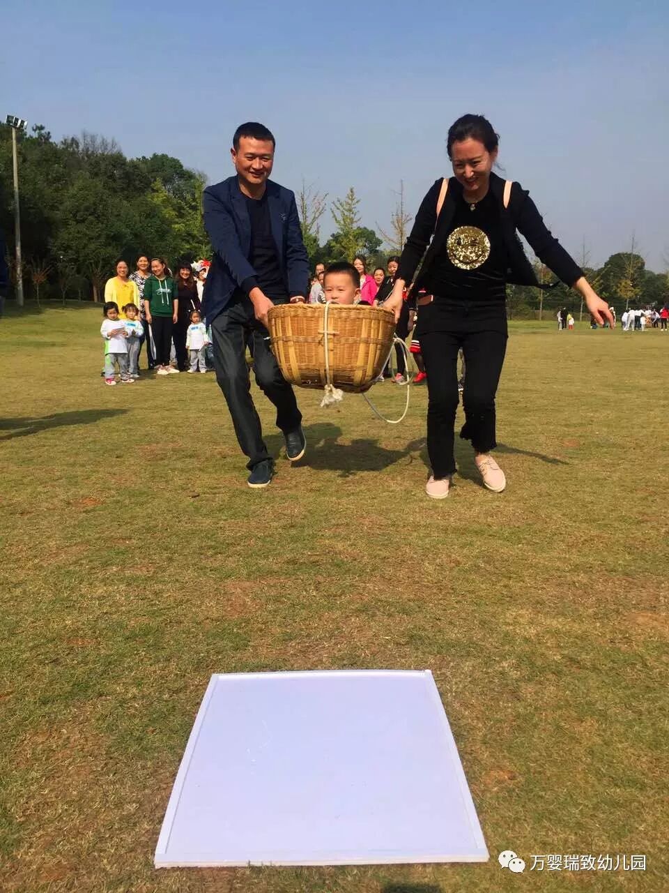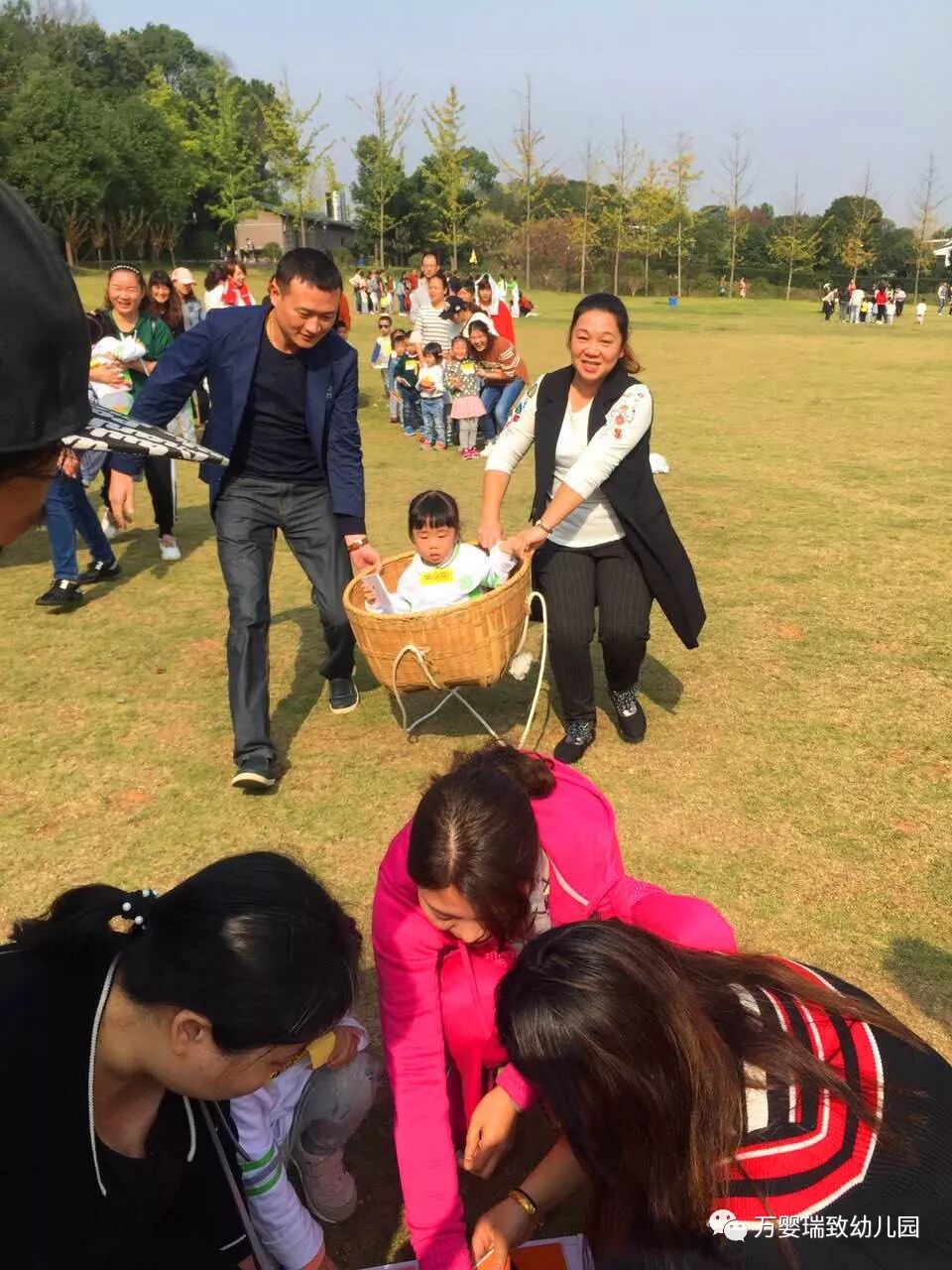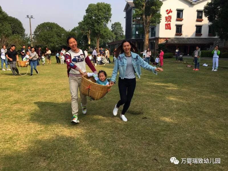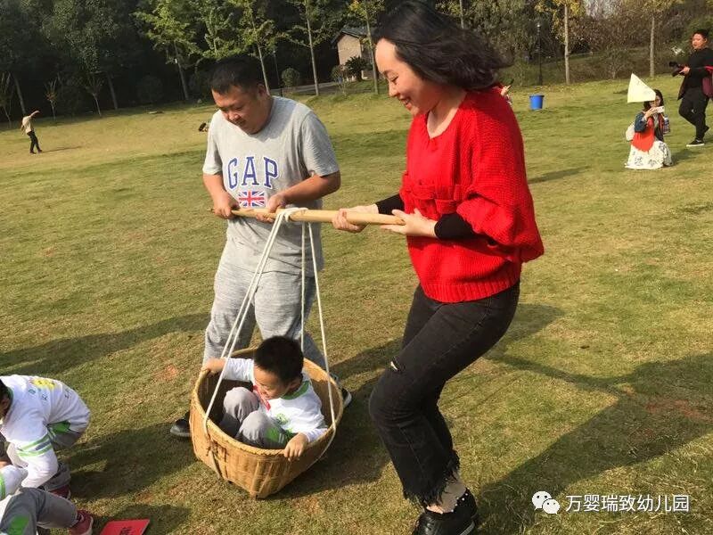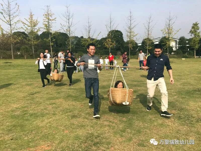 游戏分为红、蓝两队。孩子坐在箩筐里,家长用箩筐抬着从起点到终点,孩子到达终点后拼好拼图。看,宝贝们一个个被抱起,然后抬起,给家长们点个大大的赞!当然孩子们也很棒哦,在合作中完成了拼图。大人小孩通力合作完成了游戏,玩的很开心呢!