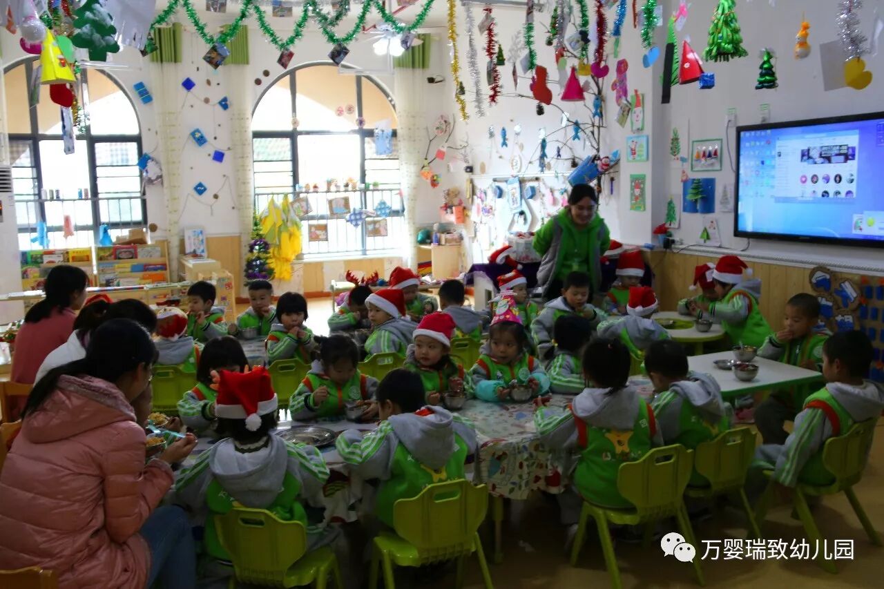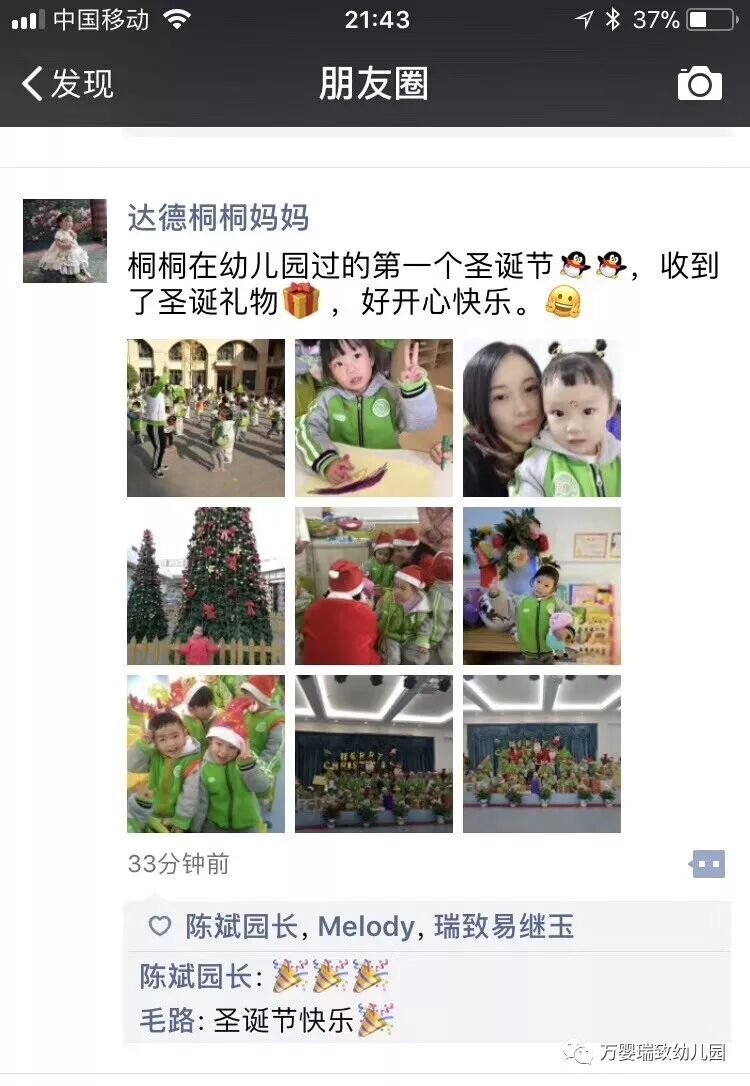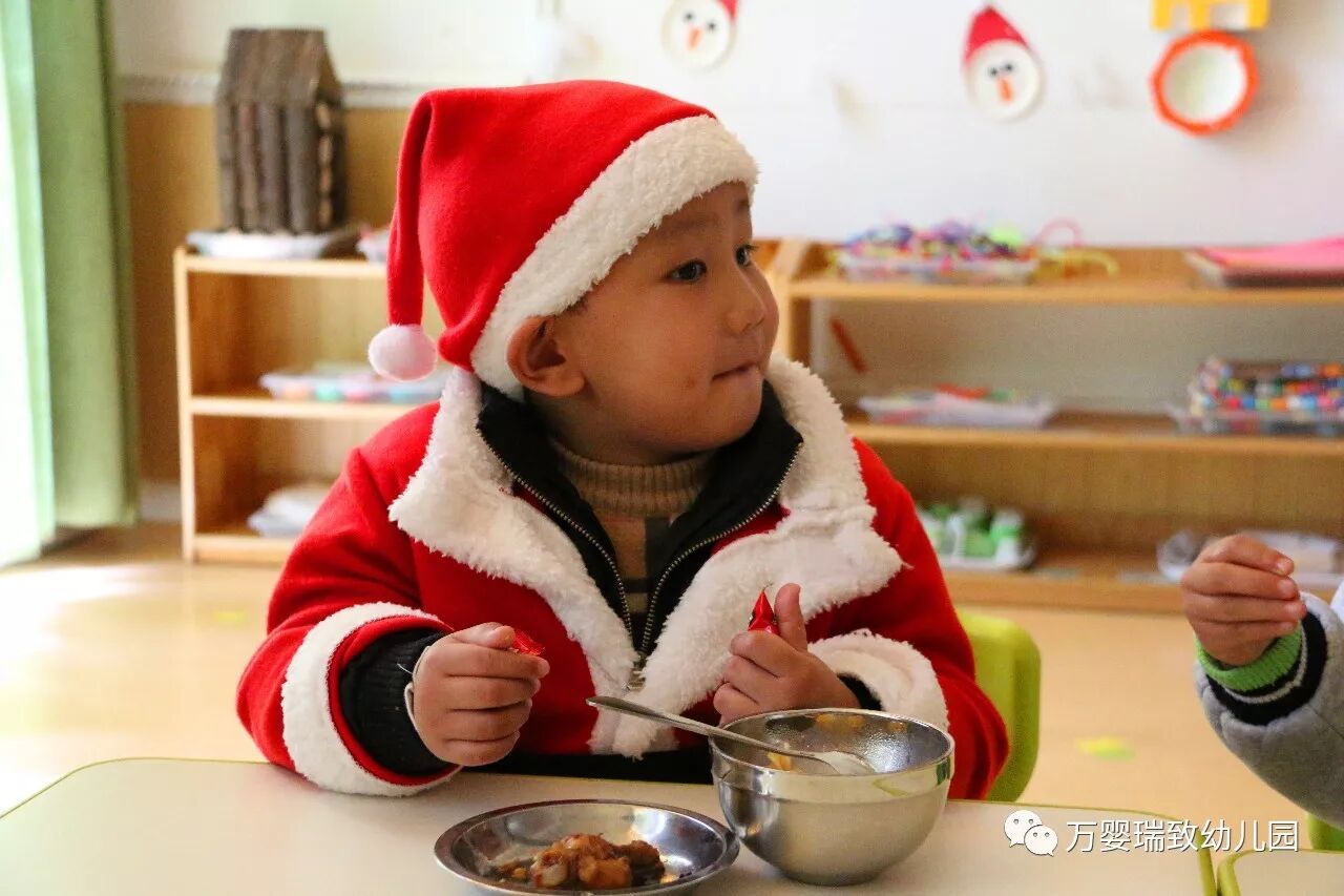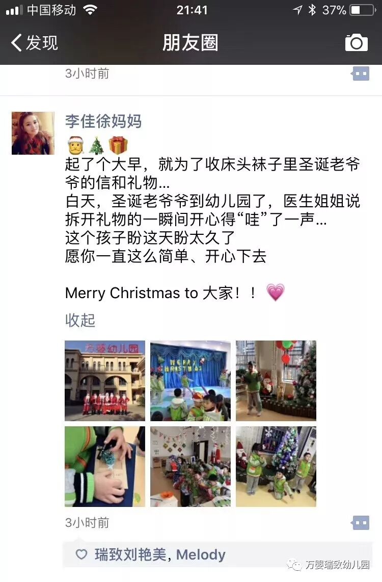圣诞的脚步,伴着飞舞的雪花,圣诞老人驾着鹿车,一路欢歌向我们款款的走来。为了让孩子们感受到不一样的圣诞节,万婴瑞致园的小伙伴一起来一次快乐圣诞之旅…… 版块一:快乐圣诞,我会坚持…… 1.宝贝邀请爸爸妈妈一起,开展一个“快乐圣诞,我会坚持……的好习惯培养活动。 2.班级学一些有关圣诞的单词,阅读相关的绘本,唱一首有关圣诞的英文歌曲或数来宝,(一首歌、一个绘本、几个句型)读有圣诞主题的绘本,做一个圣诞手工。 ▼品格护照 板块二:快乐圣诞,我会装扮 小朋友、老师、家长一起设计布置班级的圣诞节氛围。 辛苦爸爸了,已经能想象到明天兴奋的孩子们了。。。 即使再晚,带上宝贝一起来布置教室。。。 这就是布置好的教室,美美哒。。。 板块三:快乐圣诞,欢乐party 1.邀请魔术表演的工作人员来幼儿园进行表演,品尝幼儿园制作的美食,家里自备的美食。 2.圣诞才艺秀。 精彩的魔术表演。。。 哈哈,当然还有不容错过孩子们精彩表演。。。 我我我,我想上台表演。。。 捕捉几只认真看表演的宝贝。。。 哇塞,肯定很好看。。。 哈哈,好神奇吧。。。 ▲五图上下滑动查看更多 美食分享,爸爸妈妈们分享的美食太多太多了,小朋友们吃的都来不及拍照啦。。。 ♥ 哈哈,捕捉两只吃货圣诞宝贝。。 ▲圣诞老爷爷来啦,睡觉醒来后就会有神秘礼物到达,想想都激动。。。 我收到圣诞老爷爷的礼物啦。。 你高兴吗?收到礼物反正我是非常高兴的。。。 ▲四图上下滑动查看更多 ▲每个小朋友都收到了圣诞老人送到神秘礼物哦,嘘,礼物要回家才能拆哦,明年又能等到圣诞老爷爷送的礼物啦。。。 指导思想: 《3——6岁儿童学习与发展指南》社会领域之人际交往内容中也提到:引导幼儿学习平等、接纳、尊重的态度对待差异,适当向幼儿介绍我国主要民族和世界其他国家和民族的文化,帮助幼儿感知文化的多样性和差异性。 同时此次圣诞活动也得到了老师们,家长们的大力支持配合,感谢爱的付出,才会让孩子有快乐的童年。