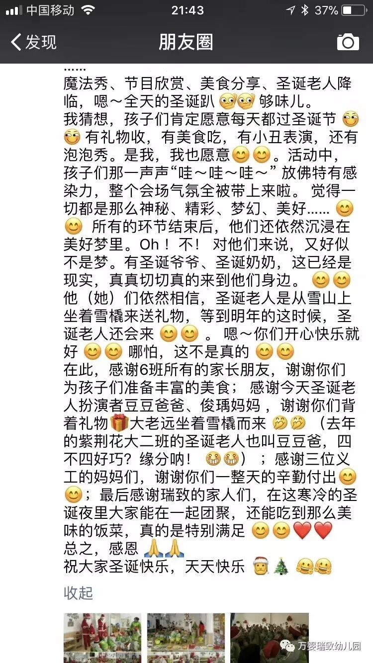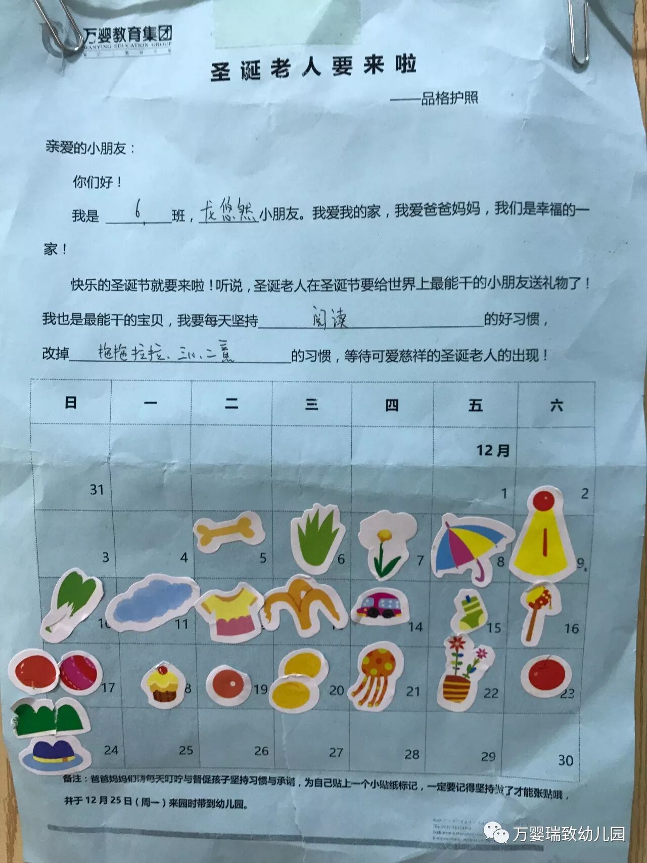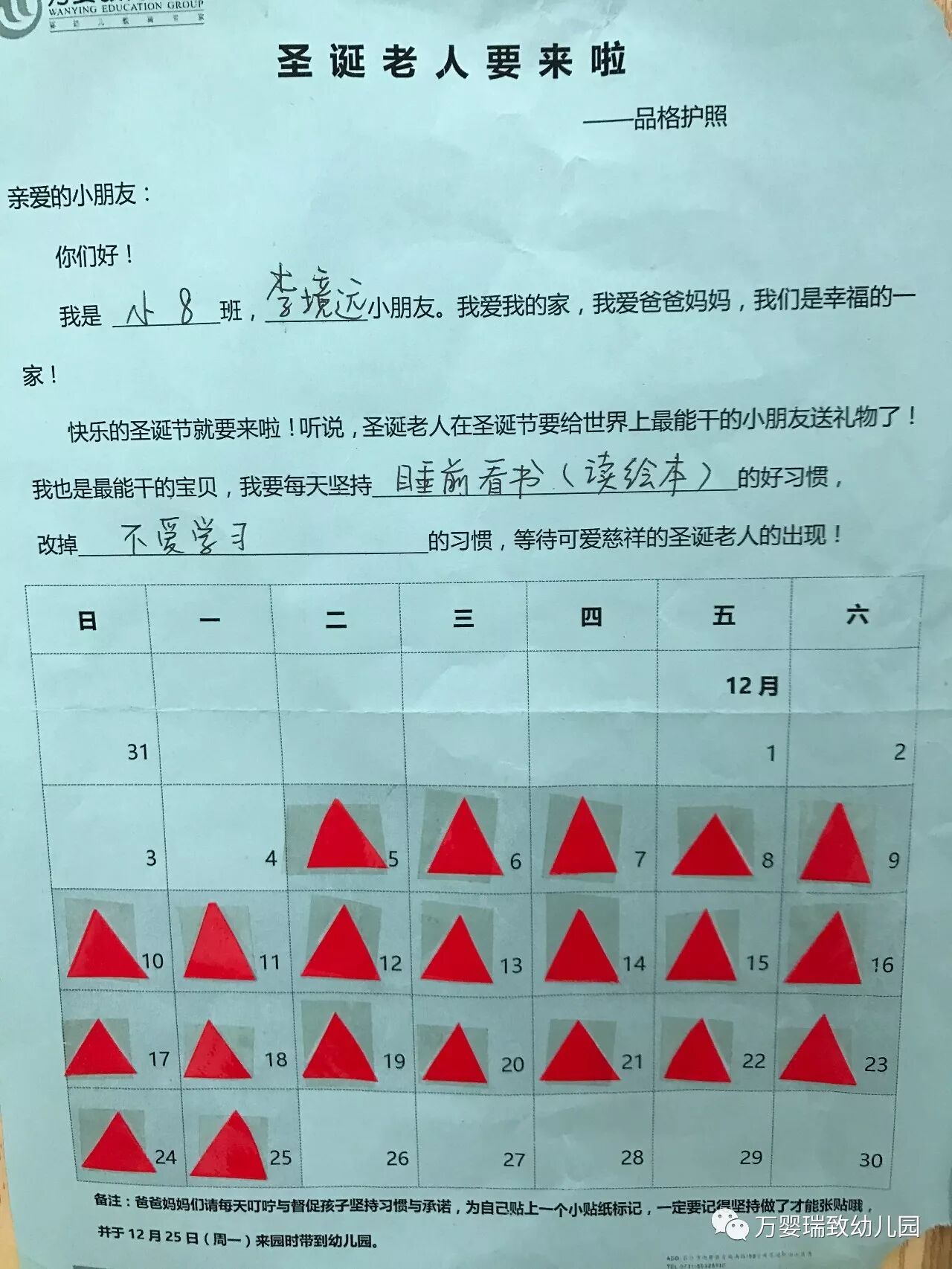 圣诞的脚步,伴着飞舞的雪花,圣诞老人驾着鹿车,一路欢歌向我们款款的走来。为了让孩子们感受到不一样的圣诞节,万婴瑞致园的小伙伴一起来一次快乐圣诞之旅…… 版块一:快乐圣诞,我会坚持…… 1.宝贝邀请爸爸妈妈一起,开展一个“快乐圣诞,我会坚持……的好习惯培养活动。 2.班级学一些有关圣诞的单词,阅读相关的绘本,唱一首有关圣诞的英文歌曲或数来宝,(一首歌、一个绘本、几个句型)读有圣诞主题的绘本,做一个圣诞手工。 ▼品格护照 板块二:快乐圣诞,我会装扮 小朋友、老师、家长一起设计布置班级的圣诞节氛围。 辛苦爸爸了,已经能想象到明天兴奋的孩子们了。。。 即使再晚,带上宝贝一起来布置教室。。。 这就是布置好的教室,美美哒。。。 板块三:快乐圣诞,欢乐party 1.邀请魔术表演的工作人员来幼儿园进行表演,品尝幼儿园制作的美食,家里自备的美食。 2.圣诞才艺秀。 精彩的魔术表演。。。 哈哈,当然还有不容错过孩子们精彩表演。。。 我我我,我想上台表演。。。 捕捉几只认真看表演的宝贝。。。 哇塞,肯定很好看。。。 哈哈,好神奇吧。。。 ▲五图上下滑动查看更多 美食分享,爸爸妈妈们分享的美食太多太多了,小朋友们吃的都来不及拍照啦。。。 ♥ 哈哈,捕捉两只吃货圣诞宝贝。。 ▲圣诞老爷爷来啦,睡觉醒来后就会有神秘礼物到达,想想都激动。。。 我收到圣诞老爷爷的礼物啦。。 你高兴吗?收到礼物反正我是非常高兴的。。。 ▲四图上下滑动查看更多 ▲每个小朋友都收到了圣诞老人送到神秘礼物哦,嘘,礼物要回家才能拆哦,明年又能等到圣诞老爷爷送的礼物啦。。。 指导思想: 《3——6岁儿童学习与发展指南》社会领域之人际交往内容中也提到:引导幼儿学习平等、接纳、尊重的态度对待差异,适当向幼儿介绍我国主要民族和世界其他国家和民族的文化,帮助幼儿感知文化的多样性和差异性。 同时此次圣诞活动也得到了老师们,家长们的大力支持配合,感谢爱的付出,才会让孩子有快乐的童年。
