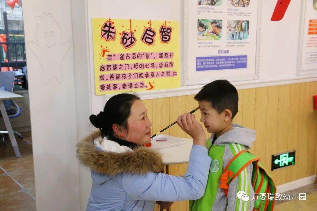家长们带着孩子依次上前,拜圣贤,谢师恩,让园长妈妈给宝贝点上一颗“朱砂痣”。痣”通古语的“智”,寓意开启智慧之门,眼明心亮,学有所成。希望孩子们能承圣人之智,仁爱处事,崇德立志。